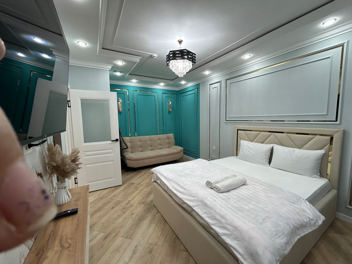 ¡Estimado huésped y residente de Shymkent! Te ofrecemos un apartamento CÓMODO Yde clase con un interior de diseño en el estilo neoclásico. El apartamento cuenta con todo lo que necesitas para tu estancia cómoda: muebles, electrodomésticos, ropa de cama y toallas limpias, equipados con albornoces y zapatillas. ¡Bienvenido, te estamos esperando! Saludos cordiales, Tu acogedor APARTAMENTO SHYMKENT