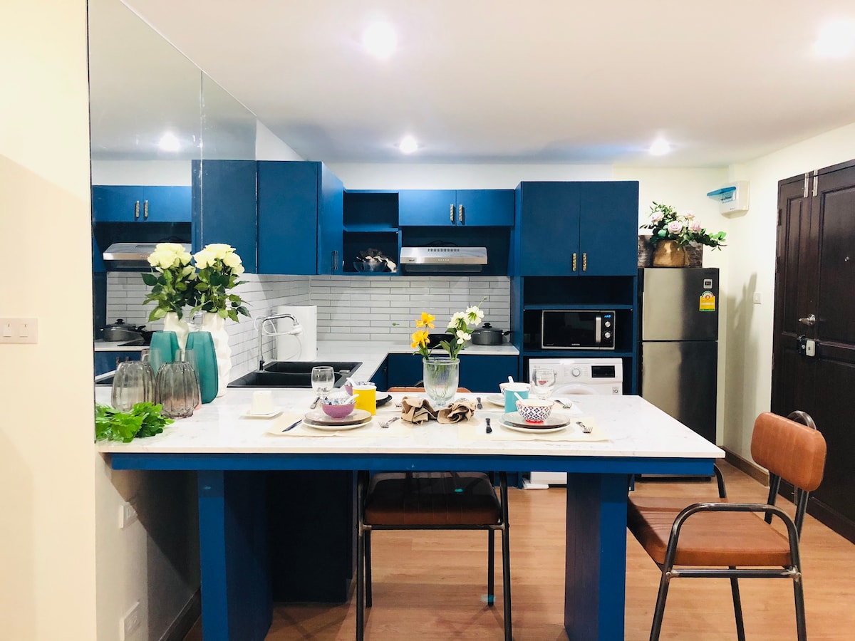 Se encuentra en el corazón de la zona de Ninman, básicamente se obtiene todo dentro de 1-5 minutos a pie. Es un nuevo condominio de renovación, de gran tamaño 110 metros cuadrados; 2 dormitorios, 2 baños, cocina completa, lavadora, grifo con filtro de agua. gran sala de estar, área de repuesto para colchones adicionales o para yoga. Un escritorio de trabajo encaja muy bien en la esquina de la sala de estar. Gran balcón al aire libre donde se puede ver la vista de la ciudad y la montaña. La piscina y el gimnasio en el primer piso son de acceso gratuito. Gran estacionamiento en el sótano.