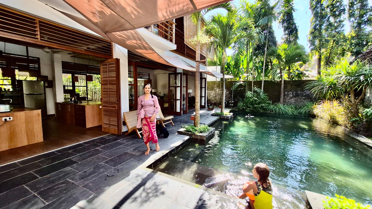 ¡Tu oasis privado en Bali te espera! Esta tranquila villa de 2 dormitorios combina el encanto balinés con las comodidades modernas, con piscina privada, cocina completa y salón, wifi rápido, un acogedor gimnasio en casa, zona de barbacoa al aire libre y divertidos extras como dardos, UNO y otros juegos de mesa. Rodeada de exuberante vegetación, a solo 10 minutos de Ubud, es ideal para parejas, familias o nómadas digitales que buscan serenidad y entretenimiento en un entorno verdaderamente relajante.