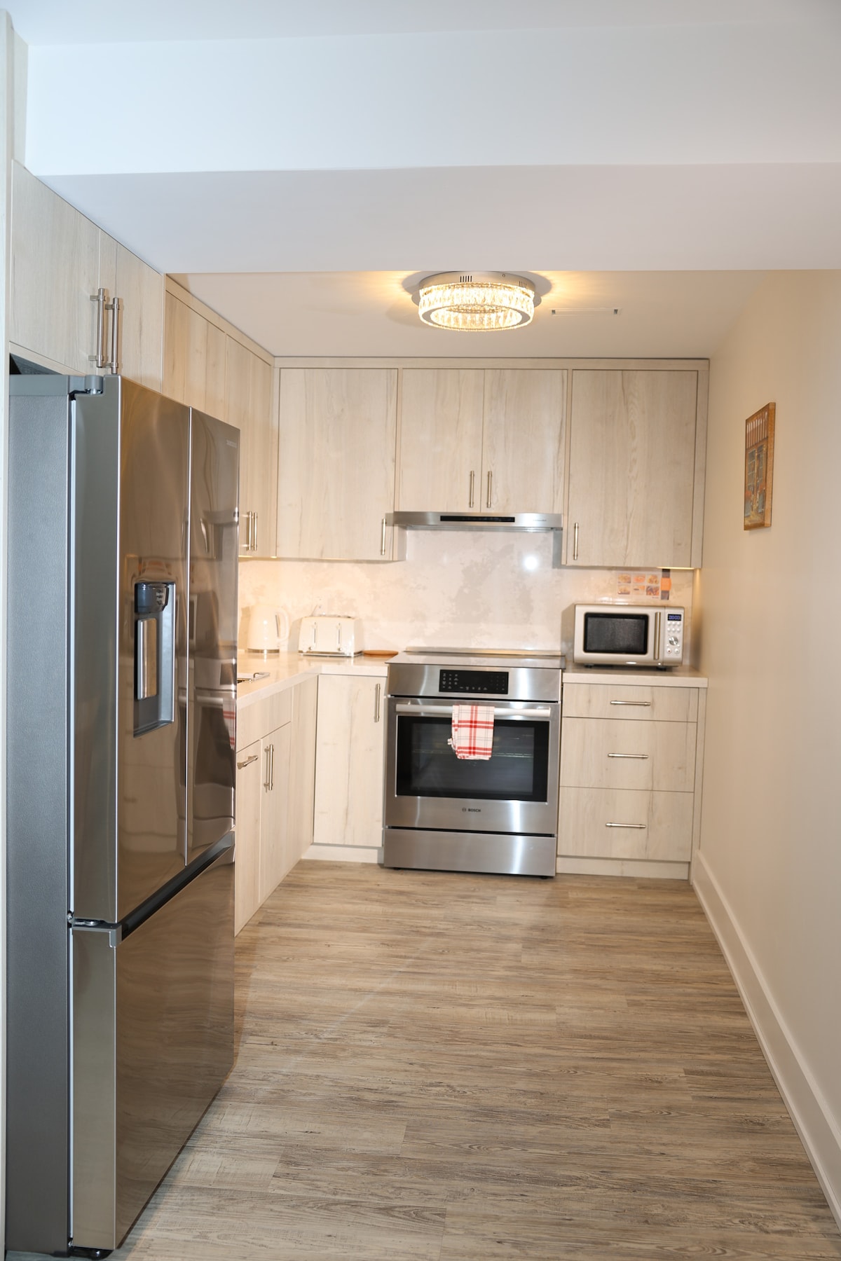 ¡Apartamento de clase alta con dos dormitorios en el sótano con entrada independiente! Extremadamente limpio, luminoso, bastante, seguro, espacioso, cómodo, en un barrio muy agradable y amigable. Internet wifi ilimitado de 3 GB/s, TV inteligente Samsung de alta gama de 55 pulgadas, además de suscripciones a Netflix, Amazon Prime Video y Disney Plus, lo convierten en una isla en el cielo para el trabajo o el retiro familiar. ¡Disfruta de una cocina moderna bien equipada para los amantes de la cocina y a poca distancia a pie de centros comerciales y restaurantes!