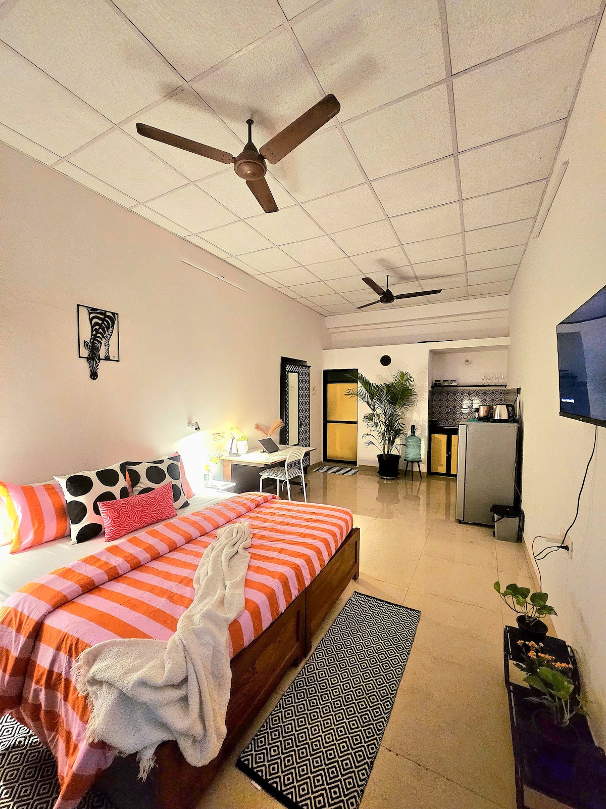 Este único 1 bhk se encuentra en Vagator, tiene un estilo propio. Tiene un hermoso patio exterior con una piscina profunda, estacionamiento privado. Este encantador lugar consta de un espacioso inodoro royale adjunto en el dormitorio con TV, aire acondicionado. Un vibrante salón con amplia luz con un sofá cómodo que también se puede usar como sofá cama. Cocina con comodidades básicas con nevera, hervidor de agua, inducción, microondas y cubiertos. Tenemos un chef de guardia. Envía un mensaje con el botón del anfitrión.