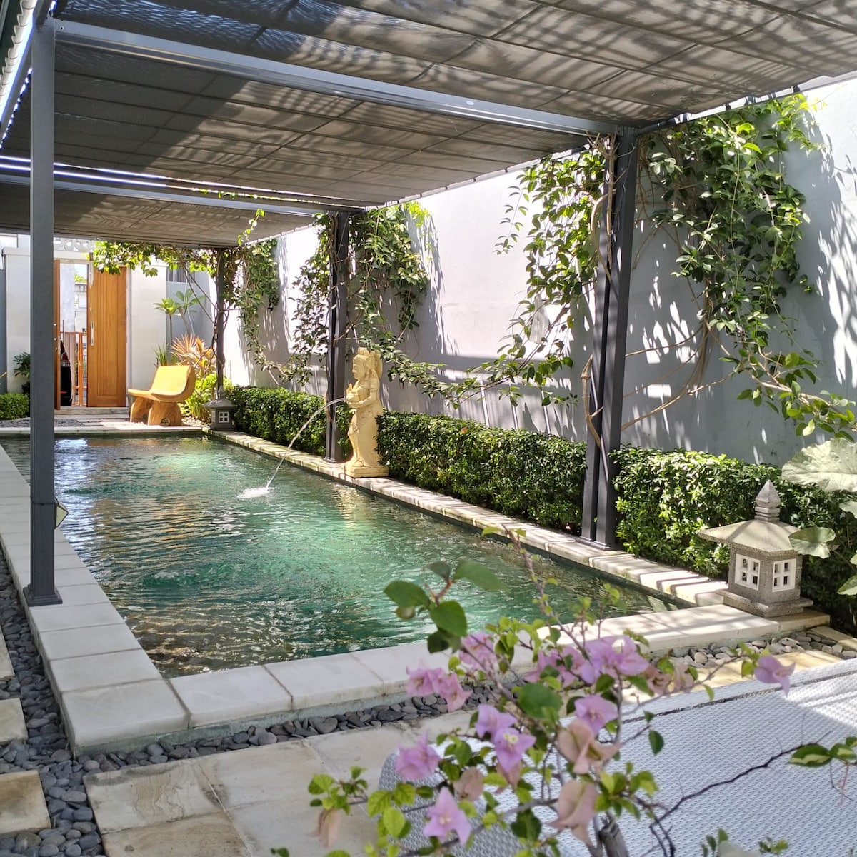 La Villa Senja es una casa única frente a la playa con un ambiente lujoso y aún auténtico debido al interior único de estilo balinés hecho a mano que cuenta con una sala de estar abierta con billar profesional, 4 dormitorios con baño privado y una enorme piscina (18x6 metros con piedras balinesas naturales). Relájate en el cenador, observa el impresionante atardecer desde la terraza, toma un cóctel en la piscina y disfruta de tu tiempo en Bali.