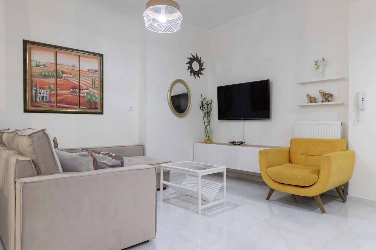 The Loft Apartment is located in the most beautiful area of Thessaloniki, in Kalamaria - 50 m from the sea - 10 min from the city center - 10 min from the airport Steps away from restaurants , cafes , bars, sandy beach, the yacht marina, sailing & rowing clubs the apartment features: - A wide open room with balcony - An equiped kitchen - A modern bathroom - 1 double bed - 1 double sofa bed - Welcome amenities - High speed internet - Free parking - Smart TV with Netflix - A/C
