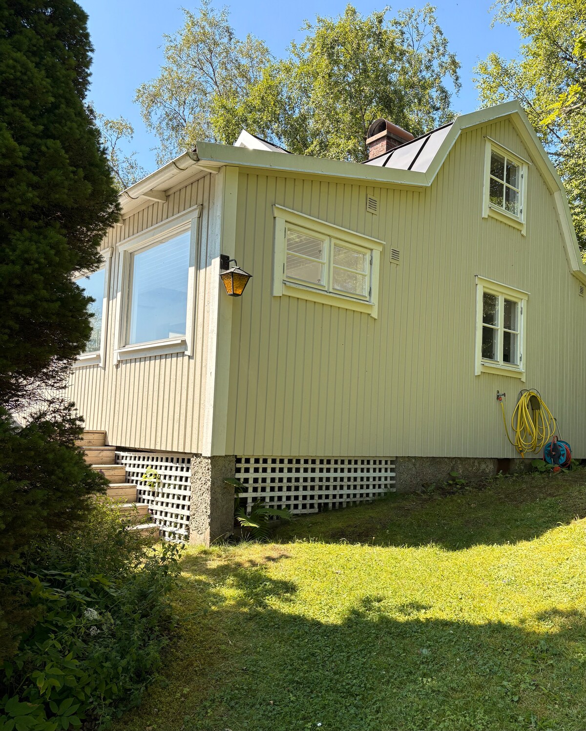 Habitación de 35 m² con cocina integrada y baño/aseo independiente. Está rodeada de árboles y vegetación, con algunas casas de campo cercanas que se utilizan como casa de vacaciones, así como residentes permanentes. Hay un sofá, un comedor, una cama individual y una cama plegable para invitados. La altura del techo es de 215 cm, hay algunas vigas en el techo, donde la altura del techo es de unos 183 cm. El departamento de invitados está en el primer piso. En el segundo piso, hay otro alojamiento en Airbnb.