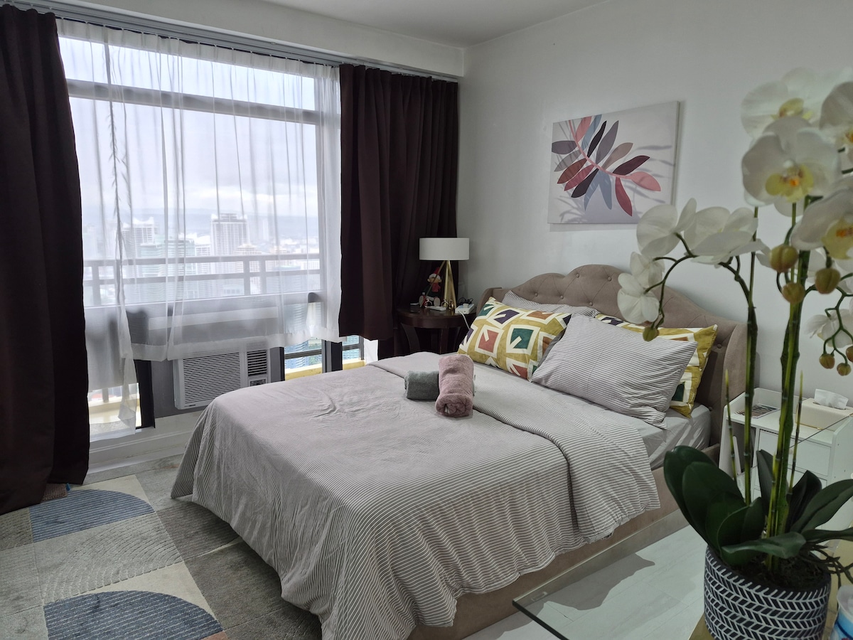 🌟 Perfecto para 4 adultos + niños, este elegante 1BR en Uptown Parksuites Tower 1 ofrece una cama principal tamaño king y un sofá cama tamaño queen con edredones suaves, un relajante masajeador de pies junto a la ventana, una cocina completa, lavadora-secadora y wifi ultrarrápido de 500 mbps. Disfruta de impresionantes vistas al atardecer y al horizonte de BGC, Grand Hyatt y Manila🌃. Después de un ajetreado día, relájate en nuestra acogedora tumbona o sofá mientras disfrutas de las luces de la ciudad✨. A solo un minuto a pie de Uptown Mall, Mitsukoshi y Landers. 🥳🤍