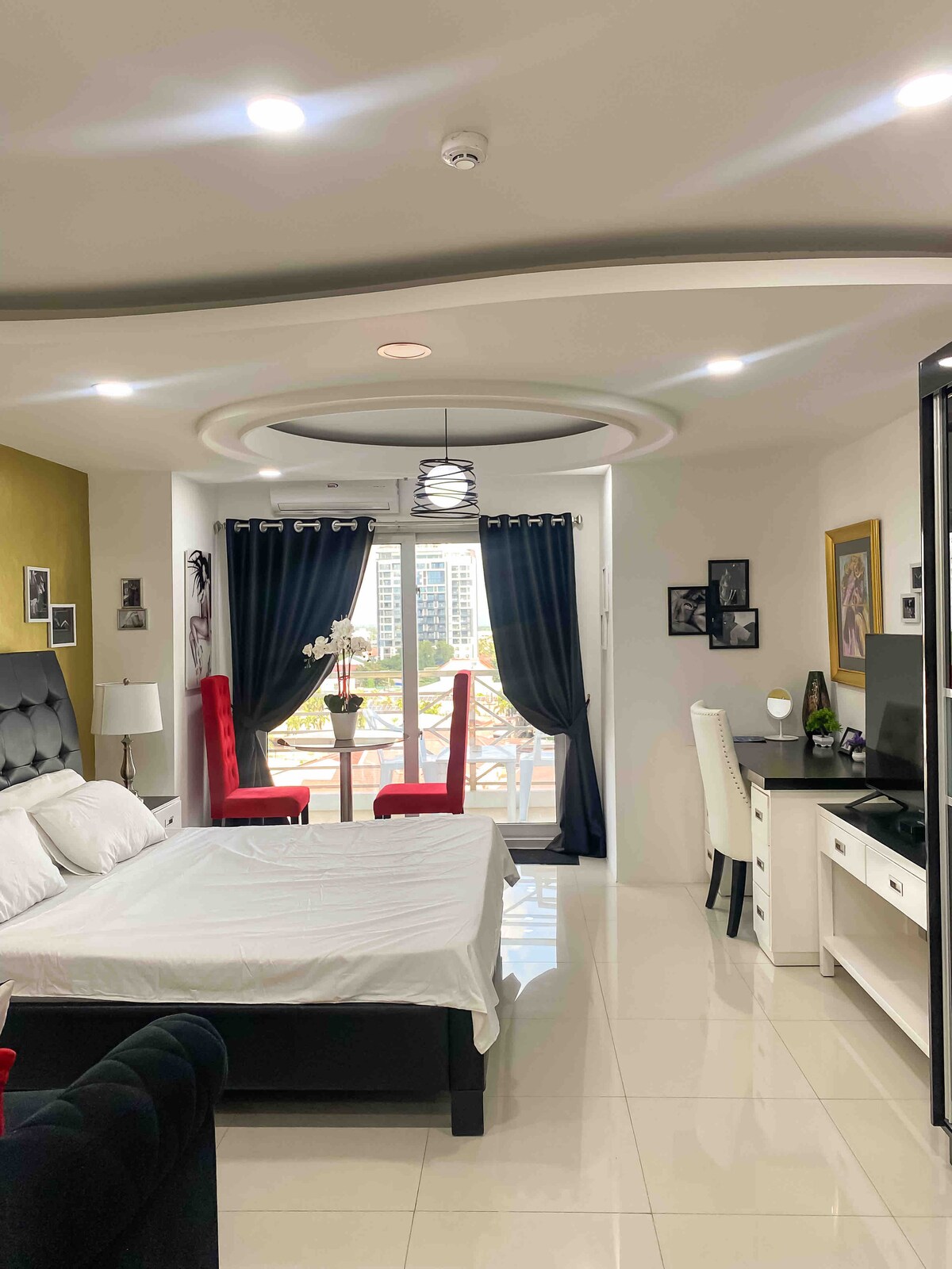 Estudio compacto muy popular de 28 metros cuadrados (201 pies cuadrados) con balcón de 4 metros cuadrados que viene con: Aire acondicionado dividido y ventilador de techo. Internet de fibra rápida de más de 200 Mbit/s con router Gigabit en la suite. Televisor LED de 55 pulgadas con Netflix y canales por cable de alta definición. Caja fuerte con combinación en el armario. Piscina de entrenamiento de 20 metros con jacuzzi. Limpieza dos veces por semana y cambio de sábanas y toallas. Limpieza diaria disponible (cargo adicional). La suite I2 está en la primera planta y NO tenemos ascensor. Contamos con guardias de seguridad las 24 horas los siete días de la semana.
