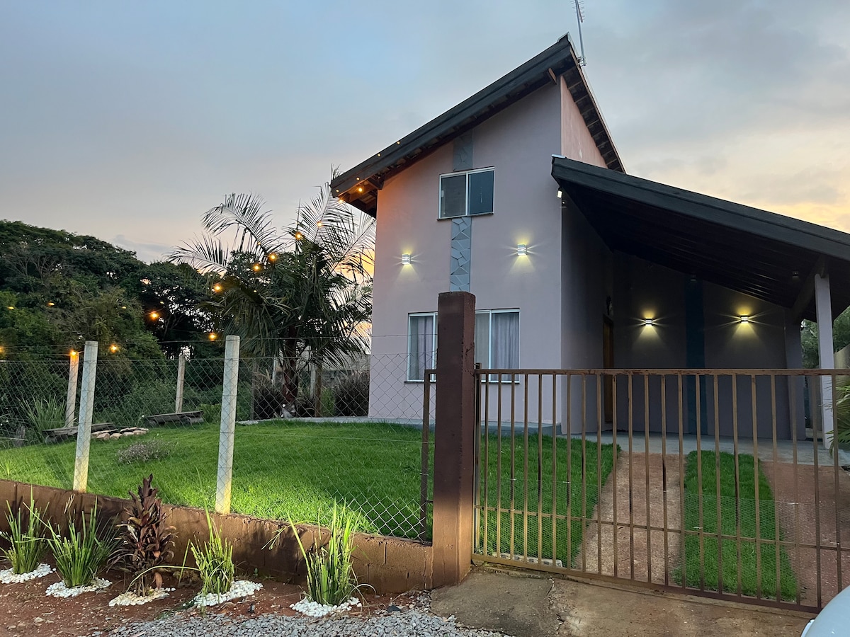 Una cabaña rústica y única en medio de la naturaleza, con 2 suites, cocina integrada con comedor/sala de estar. Zona exterior con chimenea, parrilla, terraza con vistas al lago y las montañas. ¡Tenemos un sendero privado que conduce a una puesta de sol impresionante! Estamos a 1 km del punto turístico más famoso de nuestra ciudad, la Pedra da Bela Vista y a 3 km del corredor turístico del Rio do Peixe, con varios puntos turísticos, incluyendo la Gruta do Anjo y el Parque Monjolinho.