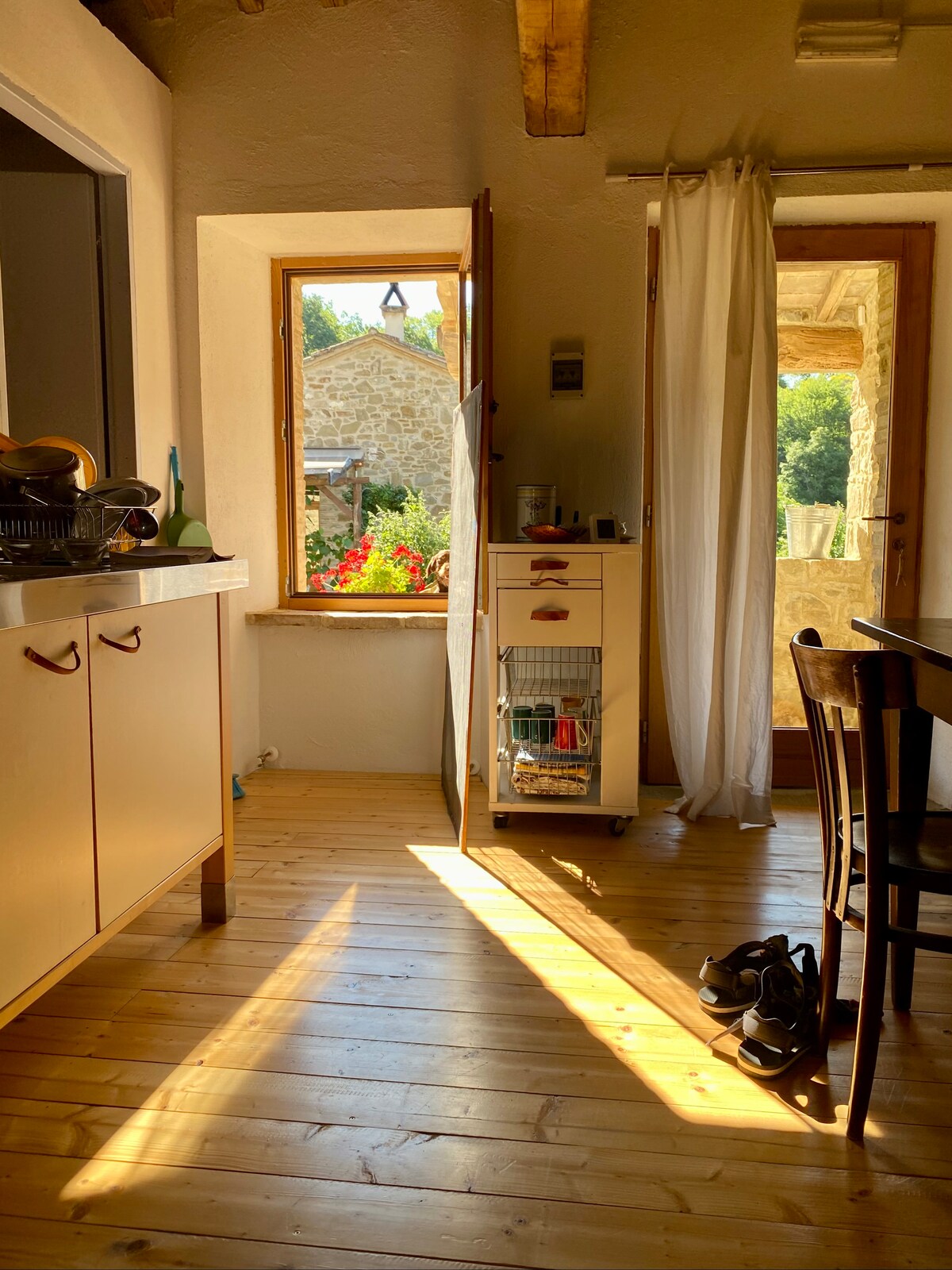 Es un anexo de 60 metros cuadrados adecuado para parejas que quieran visitar nuestra región. No tenemos piscina, pero sí trufas, arroyos, corzos, puercoespines, jabalíes, nuestros gatos y la perrita Moti. En el jardín encontraréis hierbas, frutas y productos de la huerta. Dentro de la casita que alquilamos tendrás a tu disposición nuestro aceite de oliva y el licor de helicriso que producimos nosotros. De hecho, también producimos azafrán, ¡pero este lo vendemos! ¡Por supuesto, los animales son bienvenidos!