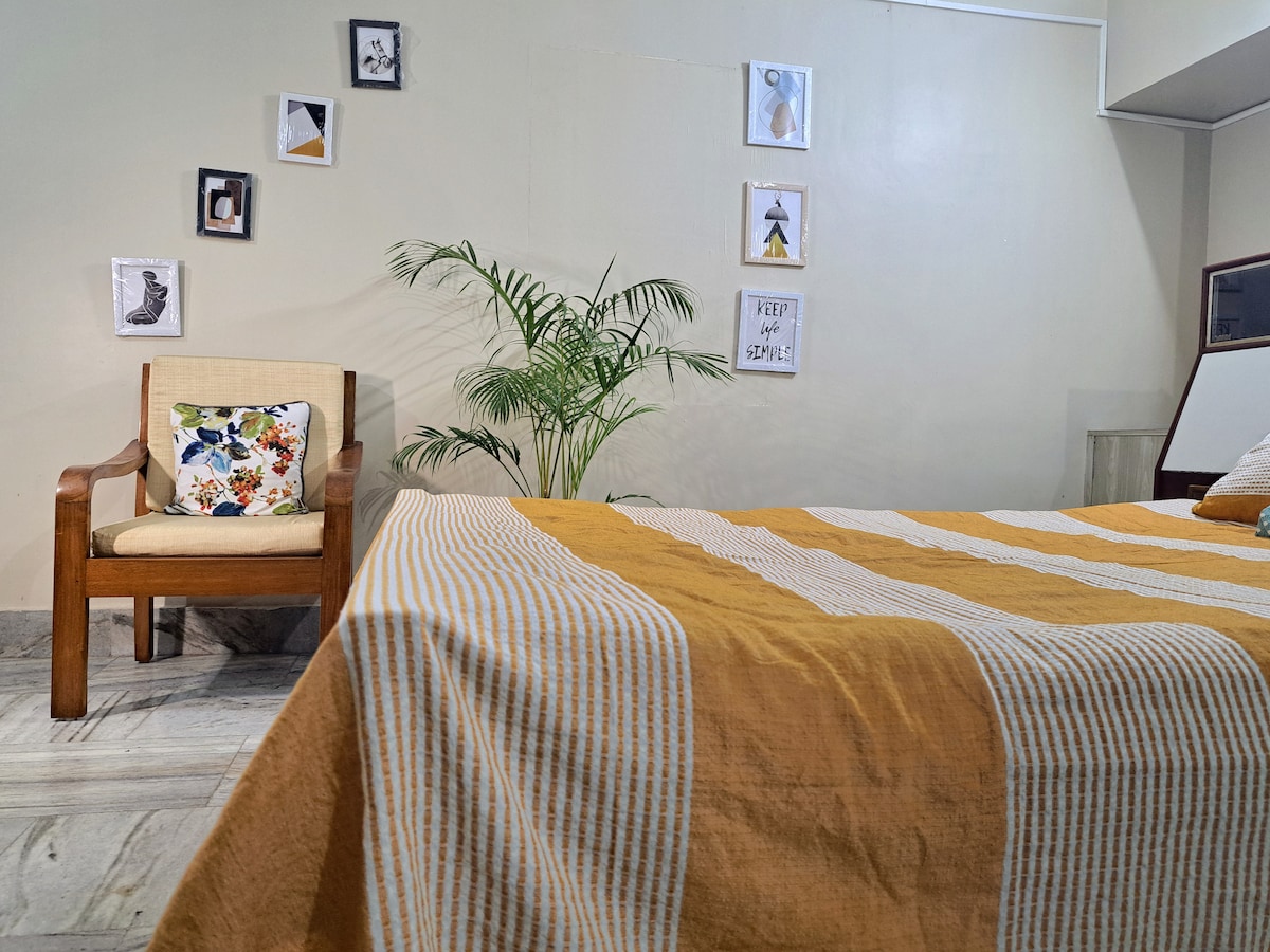 Este es un estudio sofisticado, de inspiración bohemia, de planta abierta de 612 pies cuadrados, ubicado a 3 kilómetros de Dispur. Accesible a 40 minutos del aeropuerto y a 24 minutos de la estación de tren de Guwahati, esta acogedora casa en la planta baja combina comodidad y comodidad moderna, ideal para parejas, viajeros solitarios o familias pequeñas que buscan una estancia cómoda y conveniente en Guwahati. Nos encargamos de todos los elementos básicos para que puedas centrarte en disfrutar de tu viaje.