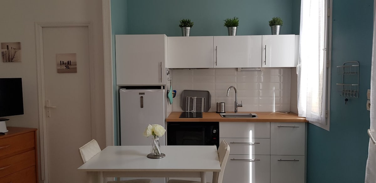 Nuestro estudio de 24 m2, se encuentra en el centro de Rochefort, a 10 minutos a pie de los baños termales, a pocos metros de la plaza Colbert y de la Corderie Royale. En la planta baja, muy tranquilo, aunque el estudio da a la calle. Consta de una cocina con lavavajillas pequeño, placas de inducción, tostadora, hervidor de agua, Nespresso, nevera con congelador separado. La cama (160 x 200) está separada del resto de la habitación por un tabique decorativo. Wifi. Totalmente renovado en 2020