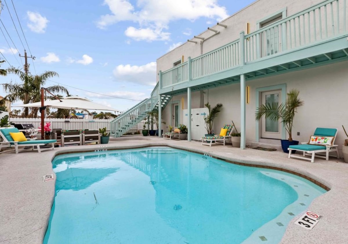 Escapada perfecta para dos o una familia de 6 que tiene un espacioso apartamento de 2 dormitorios/3 camas y 2 baños, totalmente amueblado y ubicado en el segundo piso. Cerca del distrito de entretenimiento, donde encontrarás restaurantes, tiendas, alquileres, deportes acuáticos y vida nocturna. Nuestro alojamiento está a una cómoda distancia a pie de la playa y a una manzana de la tienda de comestibles Blue Dolphin.