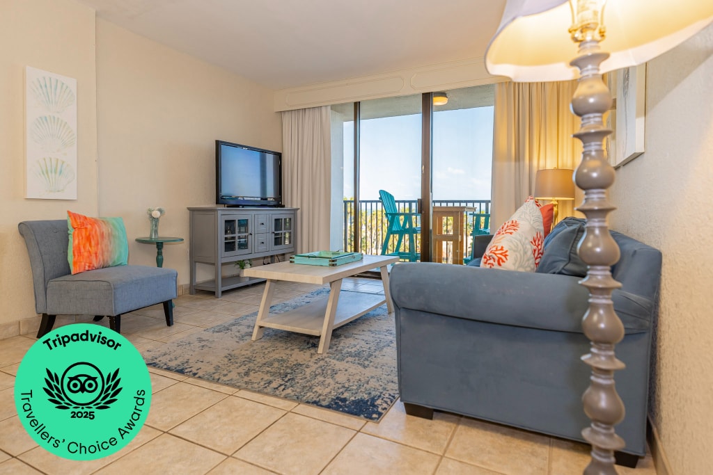 The Isla Grand Beach Resort condo features views of our pools, along with beach views. Condo #305 rooms accommodate up to 6-ppl with 1-king bed, and 2 twin beds in the second unit, and a sofa sleeper in the living room Our Condo unit Features: 2 Balconies 3 Televisions with 74- Spectrum channels Sleeper Sofas in selective rooms (included) Iron and Ironing Board Hairdryer Full size refrigerator Full size kitchen Free Wireless Internet Digital In-Room Safe at this cheerful getaway.