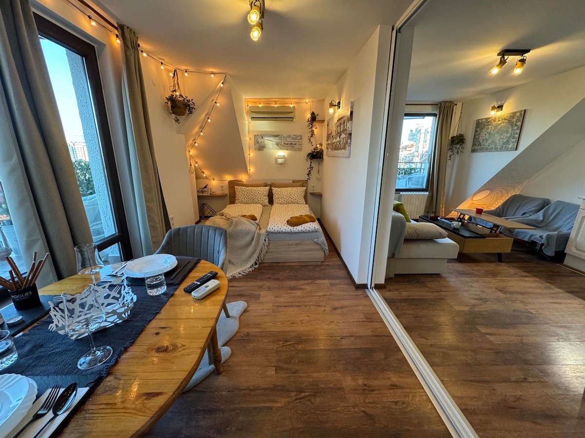 Bienvenido a mi estudio boutique en el ático al pie de Vitosha. Espacio luminoso, minimalista y tranquilo con hermosas vistas a la montaña y a la ciudad. Situado en una zona tranquila y segura, perfecto para pasear por la noche y relajarse lejos del centro. La cama cuenta con un colchón Magniflex y almohadas para un descanso excelente. El estudio tiene una cocina totalmente equipada, wifi rápido y una acogedora zona de trabajo/comedor. Limpio, tranquilo y con fácil acceso tanto a la montaña como a la ciudad.