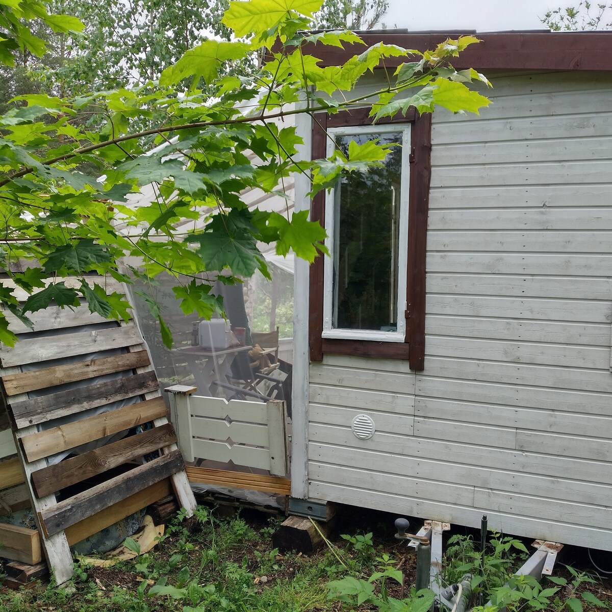 Inspirada en el arte, cómodamente ascética, casita sobre ruedas. La minicasa está decorada con arte con temática natural, y las obras cambian de vez en cuando. Los materiales de construcción de la cabaña son auténticos y de inspiración ecológica, como un piso de tabla, un techo de panel de madera completo, una pared de papel de soldadura y una pared adornada con fundas de libros antiguas. El área circundante es un antiguo patio de gabinetes de madera salvaje. A pesar de que la carretera está cerca, hay un romántico agujero de abedul en la vista. ¡El alojamiento incluye un vapor en la sauna del barril!