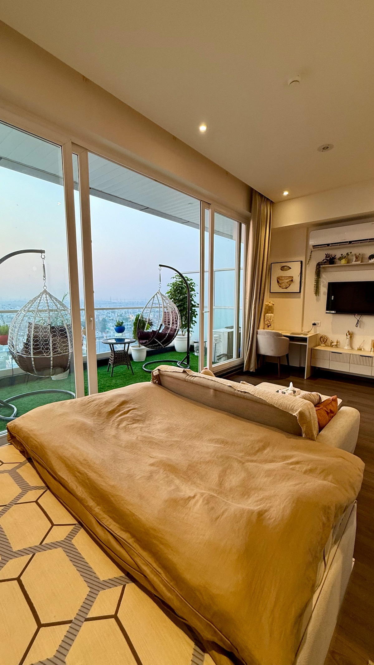 A cozy, modern Studio at Satya The Hive, Dwarka Expressway, featuring a sleek TV unit, elegant desk setup, soft lighting & elegnat décor. The space includes greenery, decorative accents, and warm beige tones that create a soothing, functional ambience. The balcony includes a cozy swing perfect for morning coffee or relaxing evening, offering a serene, modern retreat.With its inviting balcony swing, lush greenery & refined interiors, this space is more than just studio, it’s lifestyle experience.