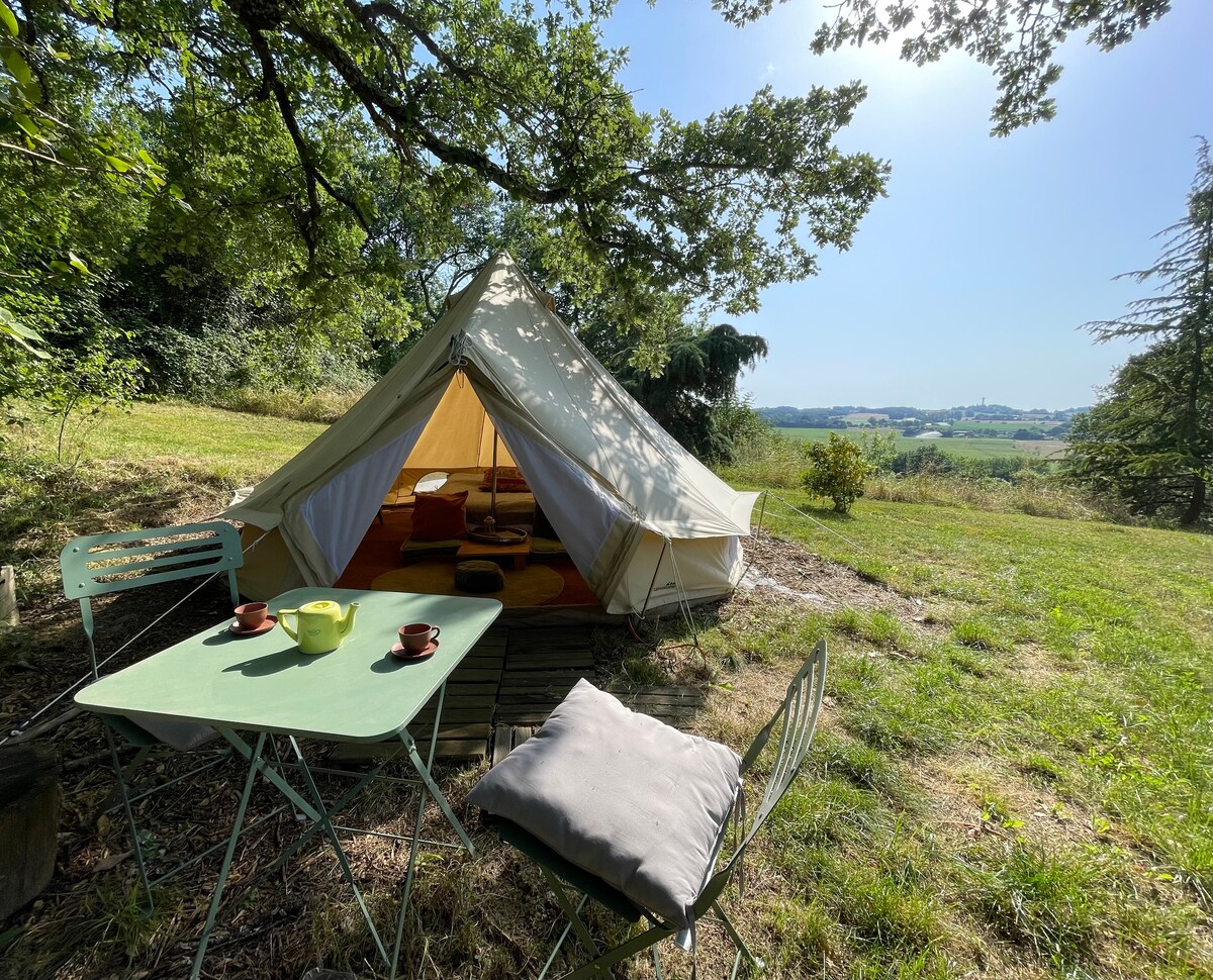 Tipi Apache équipé avec Jacuzzi privatif situé au milieu d'une forêt de chênes. Venez profitez en pleine nature d’une escapade à deux et vivez dans cet hébergement atypique une expérience apaisante et loin du stress quotidien. Plusieurs chemins de randonnées vous permettrons de découvrir nos paysages vallonnés à deux pas. Lit fait, linge de toilette fourni, douche solaire, Climatiseur, hamac, plancha, mini frigo, vaisselle, cafetière.
