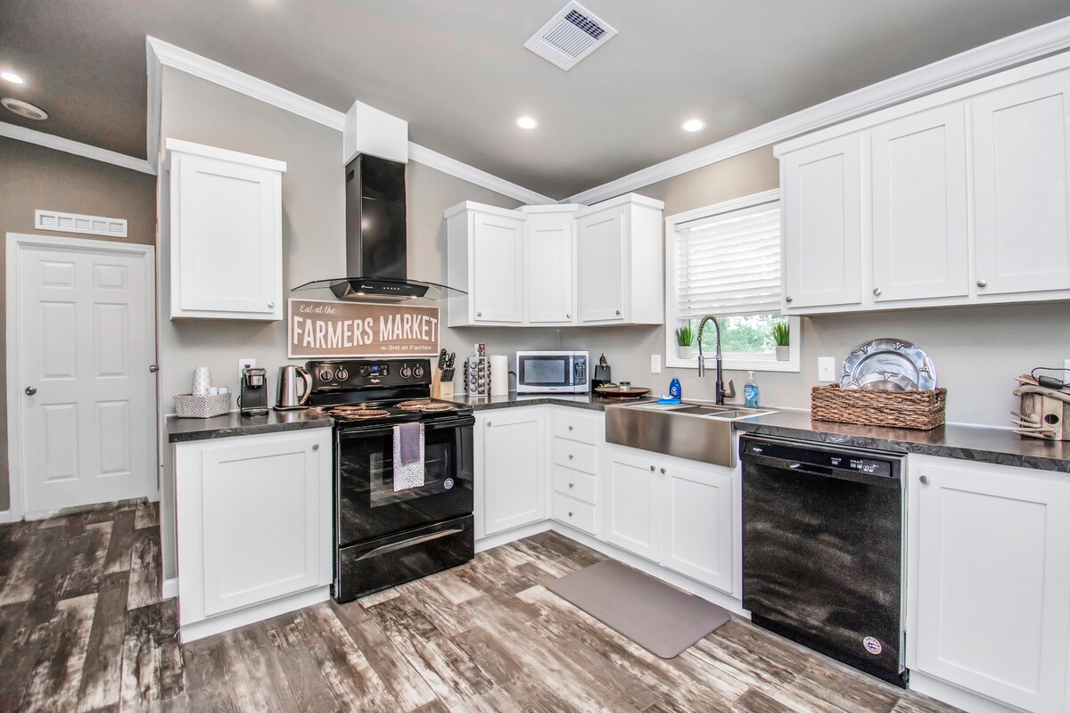 Espacioso refugio rústico de 3 dormitorios y 2 baños en un acre privado a solo 45 minutos de Houston. Cuenta con suelos de madera, techos de madera, una cocina de chef totalmente equipada y un gran porche trasero cubierto. Patio trasero vallado y tranquilo, perfecto para relajarse o llevar a su mascota. Encanto de estilo cabaña con comodidades modernas, cerca de senderos de parques estatales y diversión al aire libre. Ideal para familias, parejas o estancias de trabajo a distancia. ¡Apto para mascotas y lleno del encanto de Texas!