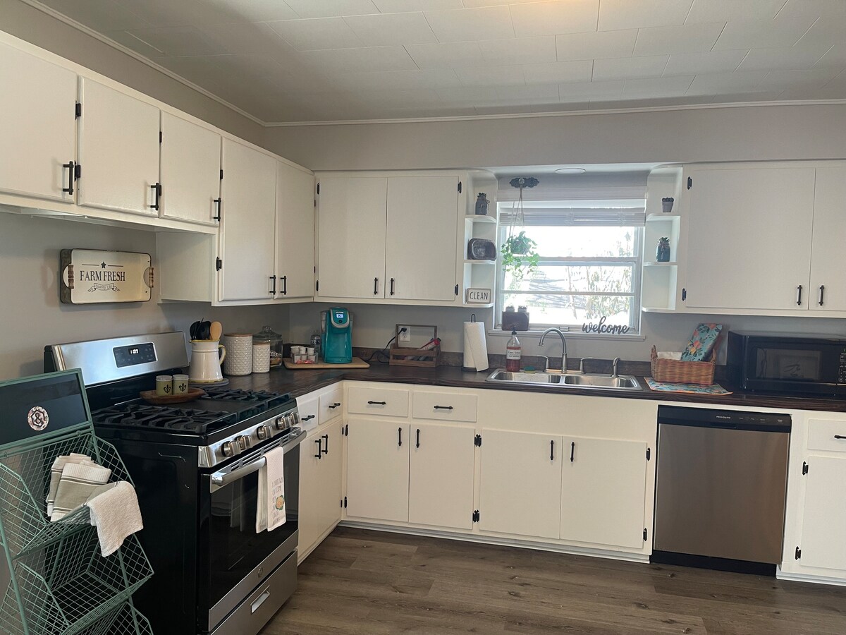 This beautiful, 2 bedroom, freshly renovated rock cabin is the perfect escape for anyone looking for a unique place to stay. With whitewashed wood accents, exposed vaulted beams & chic cabin décor this rental is full of charm. It also comes equipped with all the amenities you would expect, including; a coffee bar (and coffee), cooking utensils, DVD player and DVDs, family games, washer and dryer, and WIFI