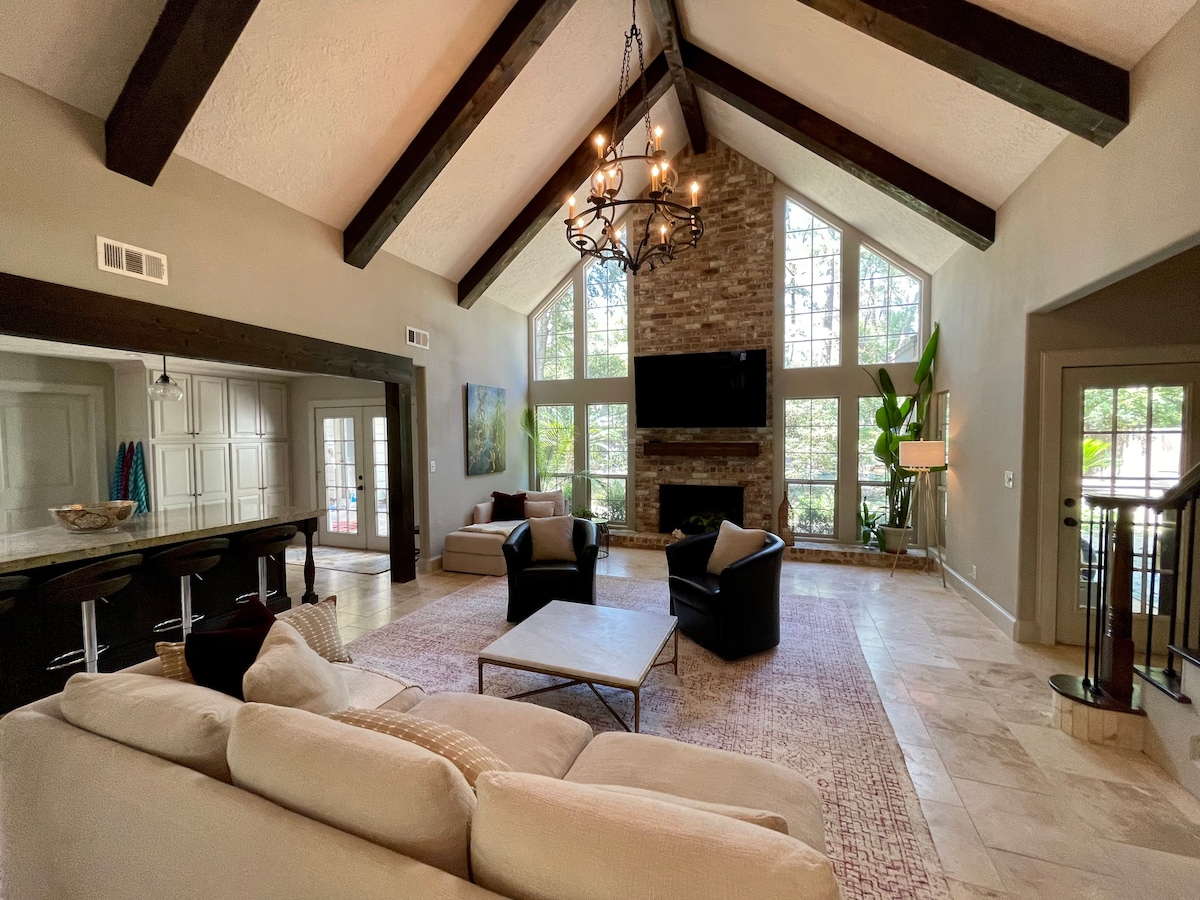 Este alojamiento único tiene personalidad propia. Moderna finca de lujo de concepto abierto. Alojamiento entero con puertas de cristal de arriba abajo. A pocos minutos de todas las hermosas atracciones de The Woodlands Texas. El lugar perfecto para venir y disfrutar de una estancia de lujo solo o con amigos, ¡hay muchos dormitorios con su propio baño! Trabaja desde casa en nuestro espacio de trabajo integrado con hermosas vistas al bosque. Crea tu propio estado de ánimo con toda la casa alimentada por luces Philips HUE.
