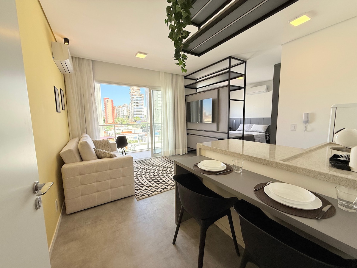 Estudio recién entregado, en un edificio nuevo en el barrio de Cambuí. El estudio tiene un dormitorio con cama doble, espacio de oficina en casa, sofá y TV inteligente (que gira entre el dormitorio y la sala de estar) para que te conectes en tu streaming favorito, balcón para relajarte y disfrutar de las vistas del piso alto, el baño y la cocina con todos los entornos integrados.