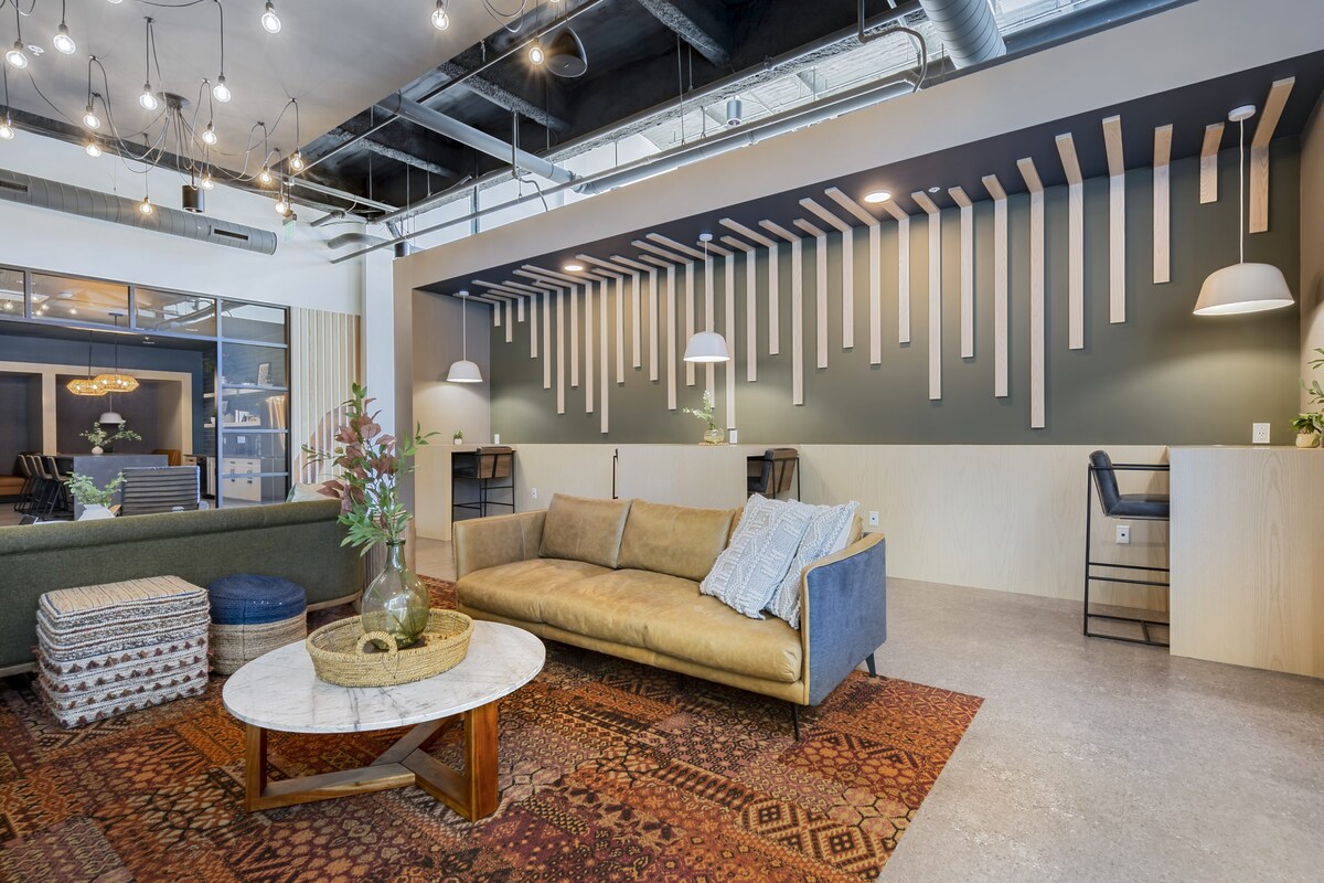 ¡Ven a relajarte en nuestra nueva ubicación! ¡Perfecto para trabajar y disfrutar! ¡Este histórico almacén se convirtió en apartamentos, pero aún conserva sus características arquitectónicas originales! Disfruta de la estética moderna industrial con techos de 15 pies de altura, paredes de ladrillo, plantas de hormigón originales y tragaluces del atrio que inundan el espacio con luz natural. Estas unidades vienen totalmente amuebladas y micro cocina (microondas y mini nevera) y todos los accesorios necesarios para que usted pueda simplemente dejar su maleta y empezar r