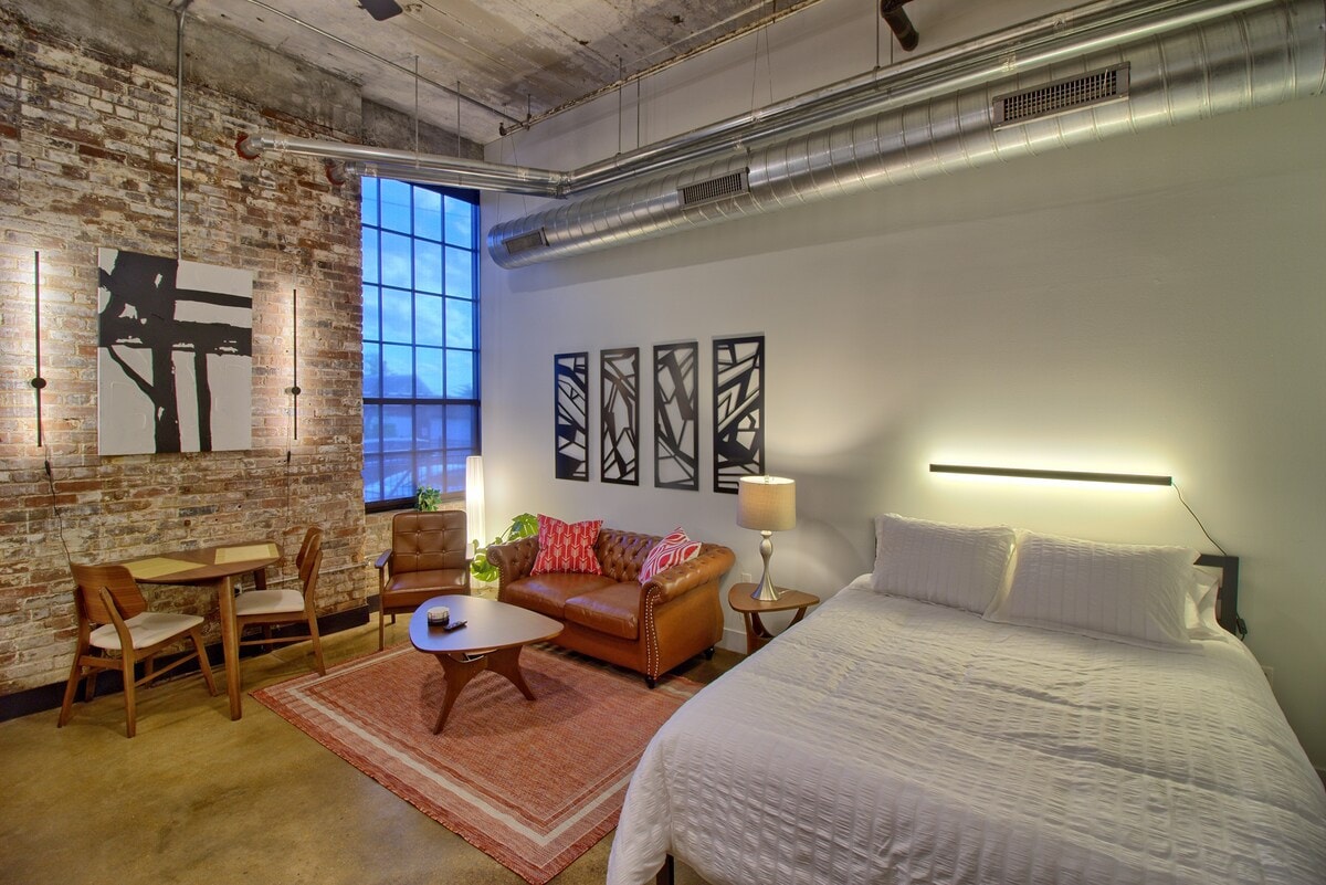 El Nash Loft es un impresionante estudio minimalista con techos de 12', una cocina totalmente equipada con electrodomésticos de acero inoxidable negro y encimeras de cuarzo, lavadora + secadora apilables, un baño de diseño con accesorios de acero inoxidable negro y ducha de vidrio sin marco, un cómodo espacio de trabajo con conexión a Internet de alta velocidad, iluminación de riel y un hermoso patio con vistas al patio. Situado a lo largo de la famosa Locust Street en el corazón de Midtown, estarás a pocos pasos de SLU, Wells Fargo, BJC y The Grove.