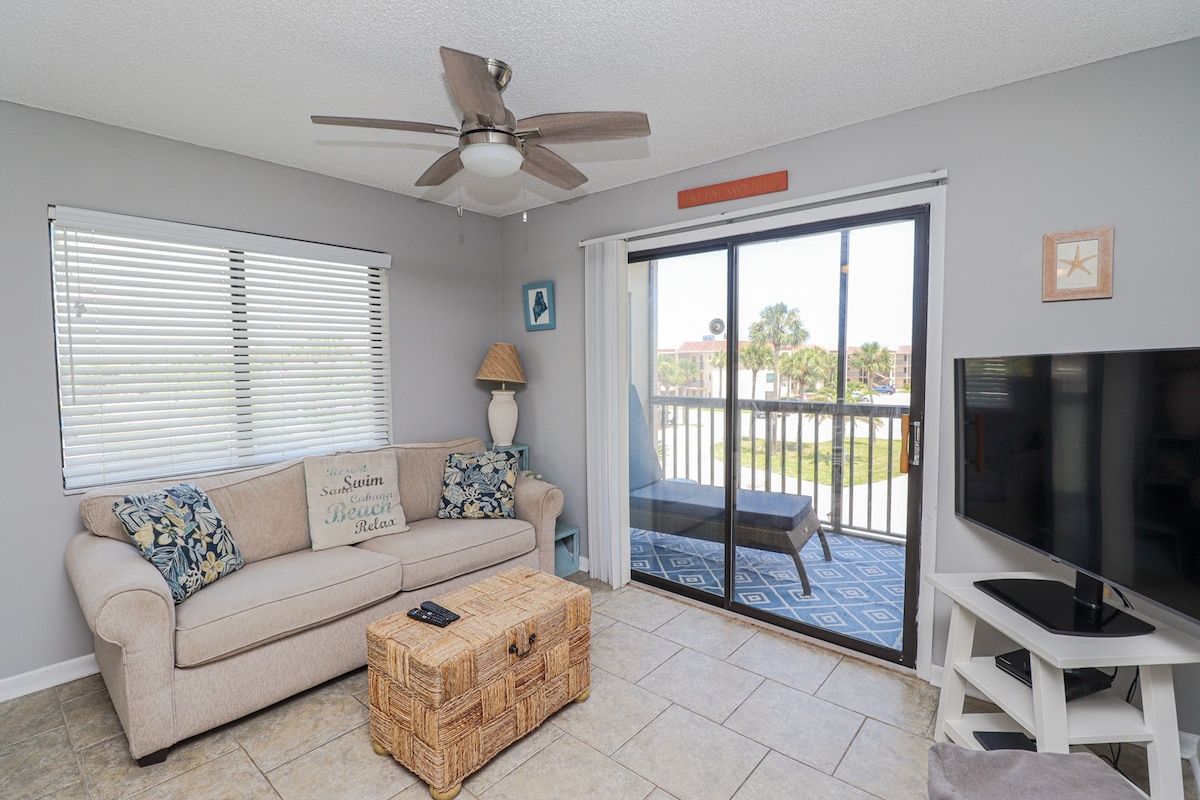Seaside at Anastasia C101 is a 3-bedroom, 2-bathroom ground floor unit within walking distance to the gorgeous beaches of St. Augustine, the local pier, and several local restaurants, coffee shops, and small businesses. You are sure to have a great stay in this beach condo with all of the nearby activities, sunshine, and history. Features: Walking distance to St. Augustine Beach A short drive to historic downtown St. Augustine Screened in private balcony Coastal decor King size bed in master be