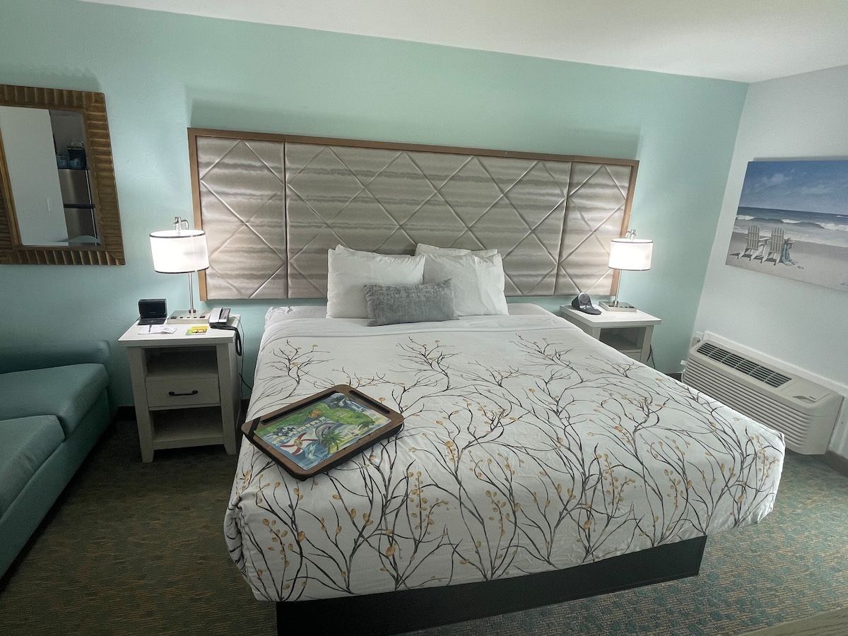 Descubre The Palm Room en Haley's Court Boutique Motel en Vilano Beach, Florida. Esta habitación cuidadosamente diseñada cuenta con una acogedora cama tamaño queen, persianas opacas para un sueño reparador y comodidades esenciales como cafetera Keurig, mini refrigerador y TV inteligente para el entretenimiento. Disfruta de un check-in sin contacto y de una ubicación privilegiada a pocas cuadras de la playa y a poca distancia en auto del centro histórico de St. Augustine. Empápate del ambiente vintage y las comodidades modernas que hacen que tu estancia sea realmente inolvidable.