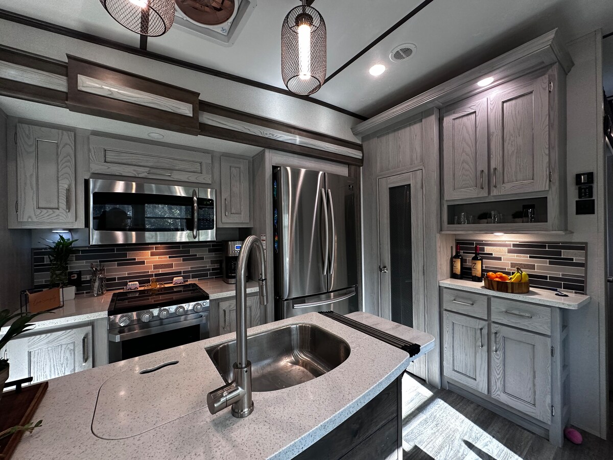 Ya sea que estés aquí para unas vacaciones en la playa, una escapada de pájaros de nieve o un retiro para trabajar desde cualquier lugar, esta lujosa quinta rueda ofrece todas las comodidades de un hogar, con un twis único • Un interior de estilo residencial con techos altos, muebles de tamaño completo y mucho espacio para estirarse. • Una cocina totalmente equipada con electrodomésticos modernos, perfecta para cocinar en casa. • Acogedora sala de estar con sillas reclinables, TV grande y chimenea para la máxima comodidad • Baño completo con ducha a ras de suelo.