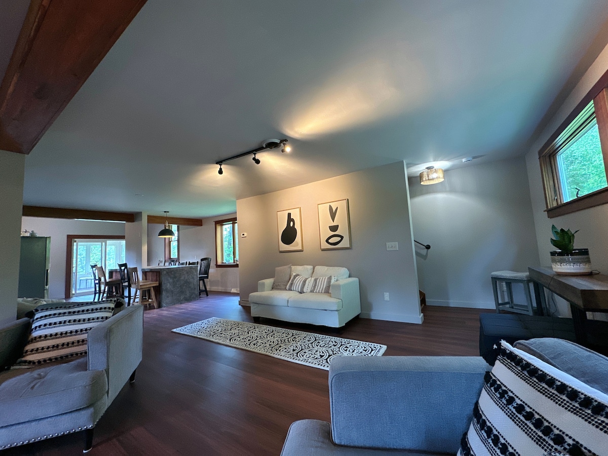 MCM de 3 dormitorios inspirado en la naturaleza, cerca de HOF, vista arbolada
