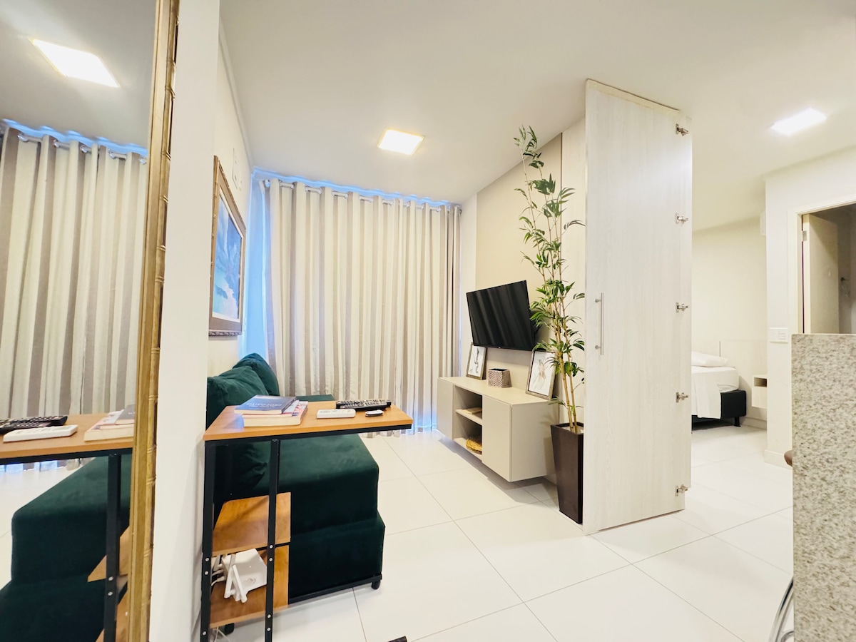 ¡Nuevo apartamento de un dormitorio con cama queen, ventilador, arara/maleiro; amplia sala con dos camas, tv/parabólica; un baño, cocina completa, área de servicio y un balcón con hamacas frescas para descansar! Ventilador en la sala. Estacionamiento con portón electrónico. ¡Barrio noble, privilegiado, tranquilo y seguro! En la calle de los Flats hay una panadería y un supermercado. Opciones para caminar y hacer ejercicio en la plaza del barrio a dos cuadras 300 m. ¡Apartamento limpio con camas/colchones de calidad!