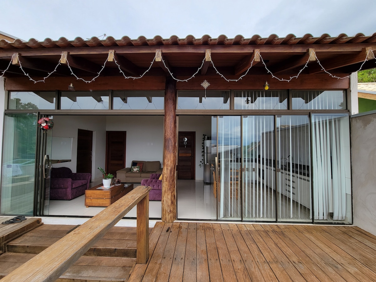 Casa elevada com deck, sala e cozinha conjugada, um banheiro que pode ser acessado pelo quarto e pela sala. Possui um quarto grande com uma cama king e dois colchões de solteiro disponíveis. O espaço é calmo, rodeado pela natureza e tem uma linda vista pelo deck. Na área externa possui mais um quarto com banheiro e também uma edícula.