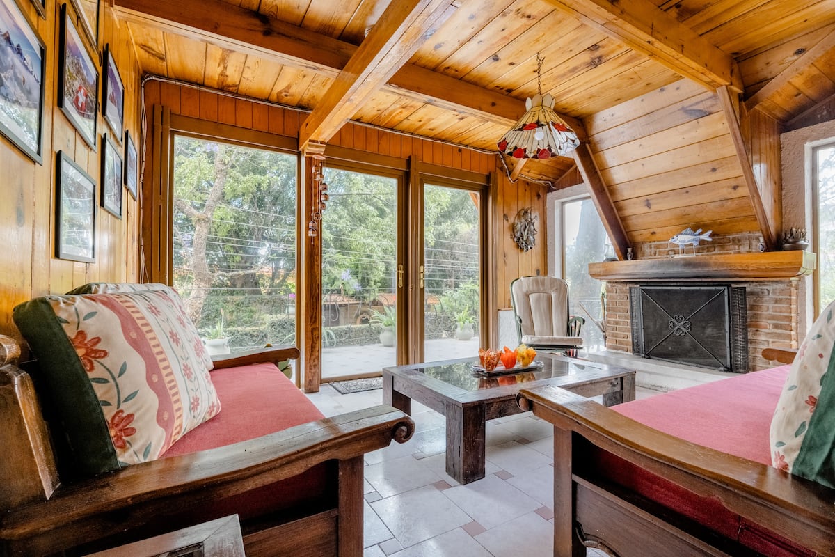 Cabaña suiza recientemente remodelada. Cuenta con amplios espacios, hermoso jardín, terraza techada, comedor interior y exterior, chimenea y asador. Este anuncio NO incluye toda la propiedad; sólo la cabaña principal. NO incluye una recámara (suite) independiente con entrada completamente separada de la cabaña que podría rentarse por otros huéspedes. Las áreas compartidas son: terraza, jardín y estacionamiento; con prioridad para quien haya reservado la cabaña. Caben cómodos 9 (máximo 11).