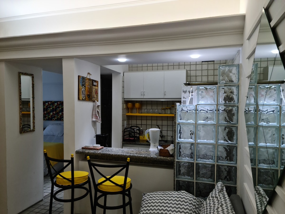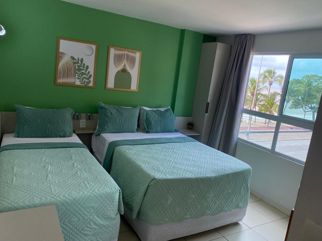 Piso de 33 m², edificio frente al mar en la principal avenida turística de João Pessoa. Tenemos conserje 24 horas, garaje, kayak, bicicleta, barbacoa, jacuzzi, piscina, gimnasio, restaurante/cafetería, coworking y lavandería. Nuestra unidad tiene espacio para recibir una silla de ruedas. Aire acondicionado, cocina, nevera, microondas, sandwichera, utensilios para preparar comidas, baño espacioso, secador de pelo, vaporizador de ropa. Cama de matrimonio, cama individual y cama supletoria.
