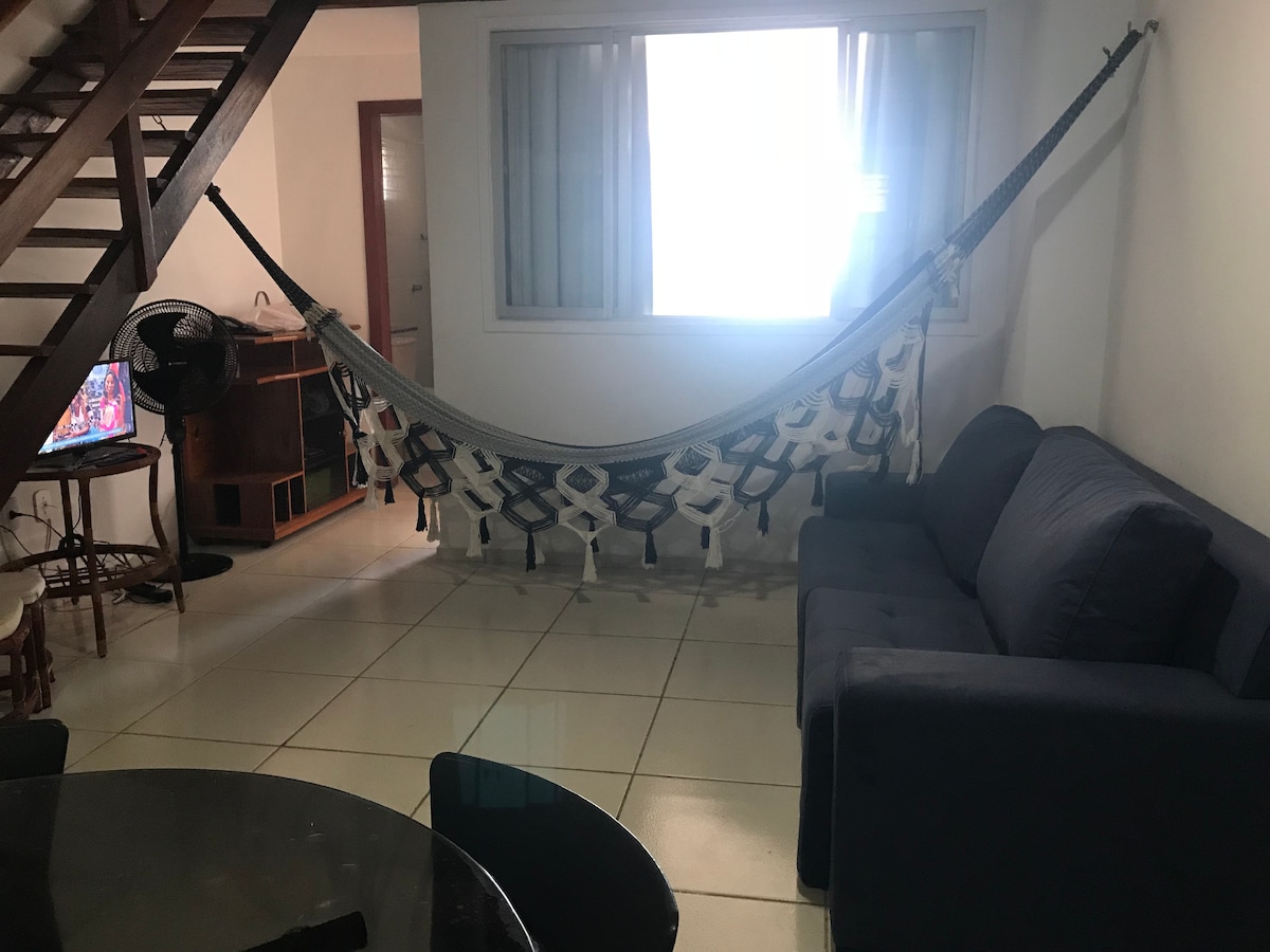 Piso duplex situado en la segunda planta del edificio (Shopping Amarração) junto al ascensor situado en la puerta 2. La primera planta cuenta con una sala de estar y cocina integrada, baño social y baño privado con ventilador (cama doble y espacio para dos hamacas). En el mezzanine tenemos un dormitorio con 2 camas individuales y una cama matrimonial, así como aire acondicionado. También cuenta con plancha, refrigerador, estufa, sandwichera, licuadora. Nota: No proporcionamos sábanas ni toallas personales.