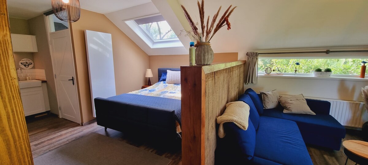 Deze sfeervolle vakantieruimte met eigen opgang bevindt zich op de plek in een gerenoveerde stal waar ooit de hooizolder was. Er zijn twee eenpersoonsbedden (tegen elkaar aan), een tafel met stoelen en een relax stoel met voetenbank. Je maakt gebruik van de douche, wc en keukenblok (geen kookgelegenheid! en geen magnetron) net even buiten de vakantieverblijf. Handdoeken/keukendoeken/beddengoed/waterkoker/koffiezetapparaat/afwasmiddel/WIFI/spelletjes zijn aanwezig.