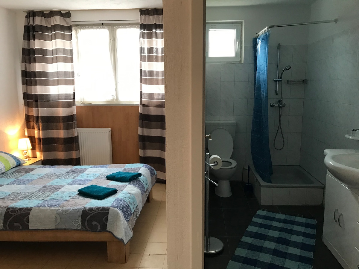 Charmantes Zuhause – ehemaliger Kindergarten mit besonderem Flair! Unser kleines, gemütliches Zimmer für 2 Personen ist heimelig eingerichtet. Ein echtes Highlight ist das bunte, individuell gestaltete Badezimmer. Es enthält besondere Stücke aus dem Leben einer ehemaligen Swissair-Flight-Attendant – eine stilvolle Mischung aus persönlicher Geschichte und Nostalgie. Ein liebevoller Rückzugsort mit persönlichem Flair! Zusätzlich gibt es eine winzige Küche mit Tisch, 2 Stühlen, Kaffeemaschine