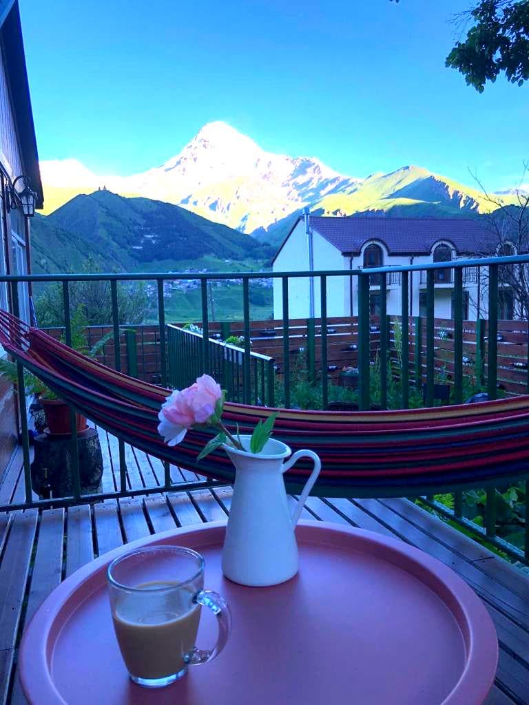 Nuestra casa está ubicada en el centro de Kazbegi, con hermosas vistas de la Trinidad de Gergeti y las montañas de Kazbegi.