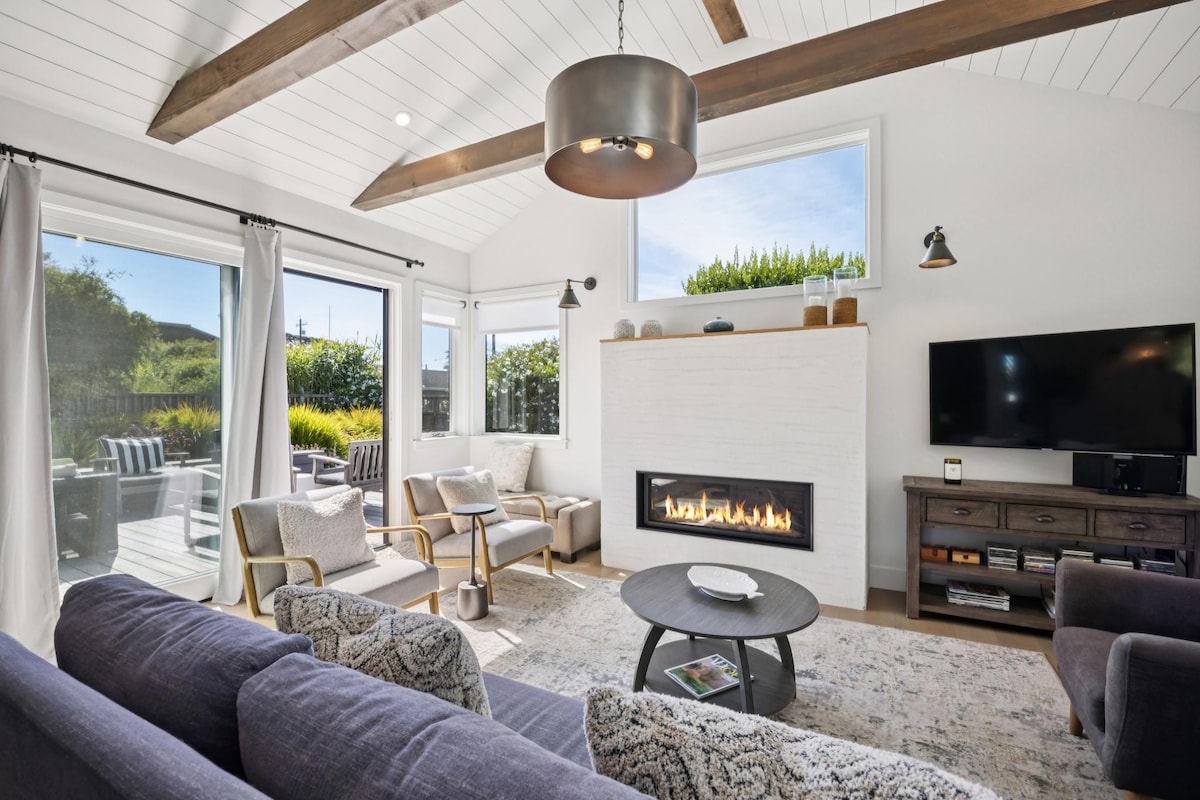 Elegante plano de planta abierta en esta casa recién construida. Ubicación perfecta a solo 5 casas de la playa. Lo suficientemente lejos de la ciudad como para evitar las multitudes, pero lo suficientemente cerca como para llegar a pie al pintoresco pueblo en 10 minutos. Gran volumen y luz en toda la casa con hermosos acabados. Cocina de chef, chimenea lineal de gas. Gran terraza junto a la sala de estar principal con mesa de comedor y jacuzzi en el patio de guijarros. El garaje/habitación de desbordamiento ofrece un sofá cama tamaño queen, TV de pantalla plana, juegos y lavandería. Estacionamiento para 3 coches.