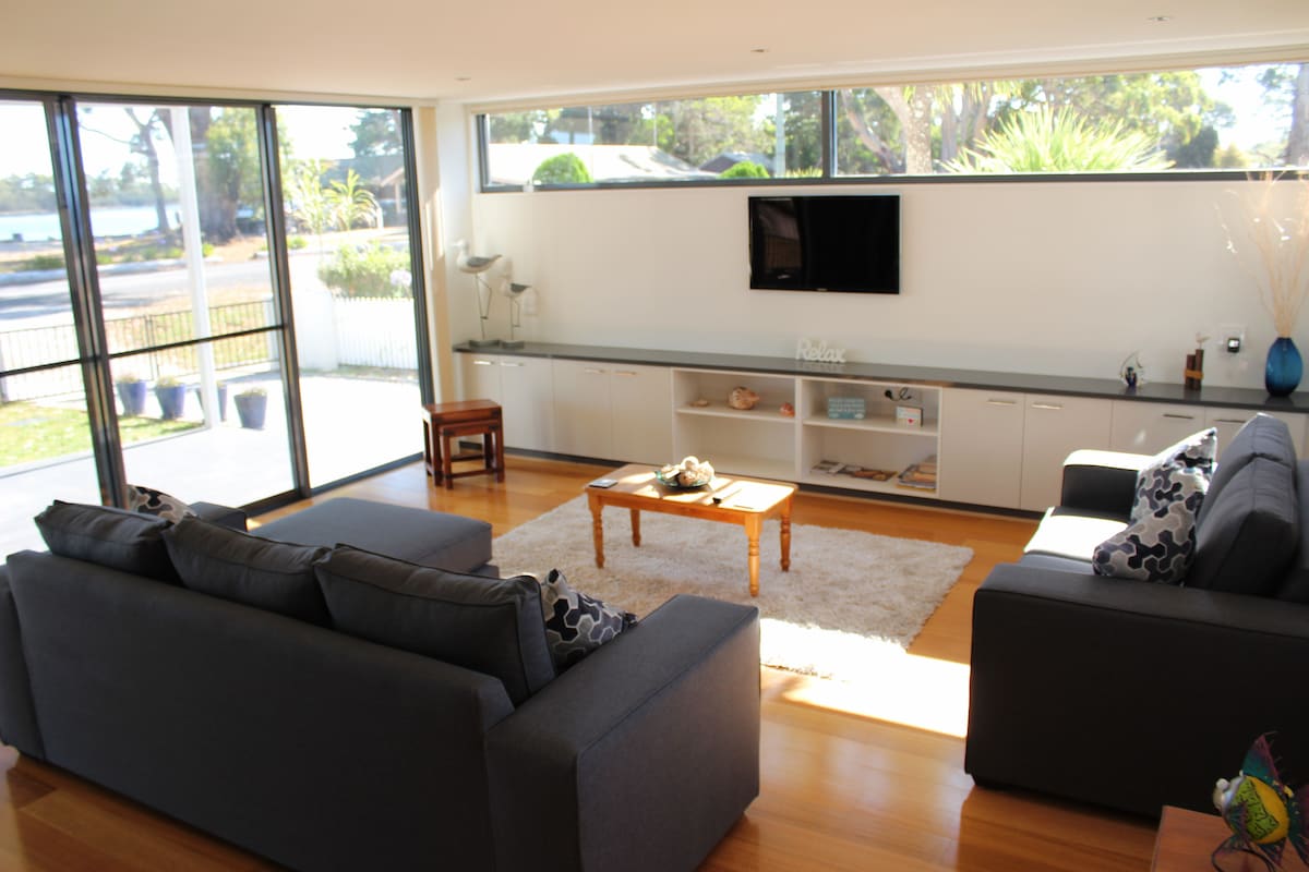 Dos apartamentos totalmente independientes, uno tiene dos dormitorios, los dormitorios principales de arriba tienen spas, baños y armarios separados. El segundo dormitorio en la planta baja frente al baño principal. Cocina totalmente equipada instalada con electrodomésticos de acero inoxidable de calidad y encimeras de banco de granito. Salones en voladizo con enormes ventanas del techo al suelo con vistas al puerto de Macquarie. Las puertas francesas se abren a tu terraza privada donde se proporcionan barbacoas. Estacionamiento doble con estacionamiento fuera de la calle.