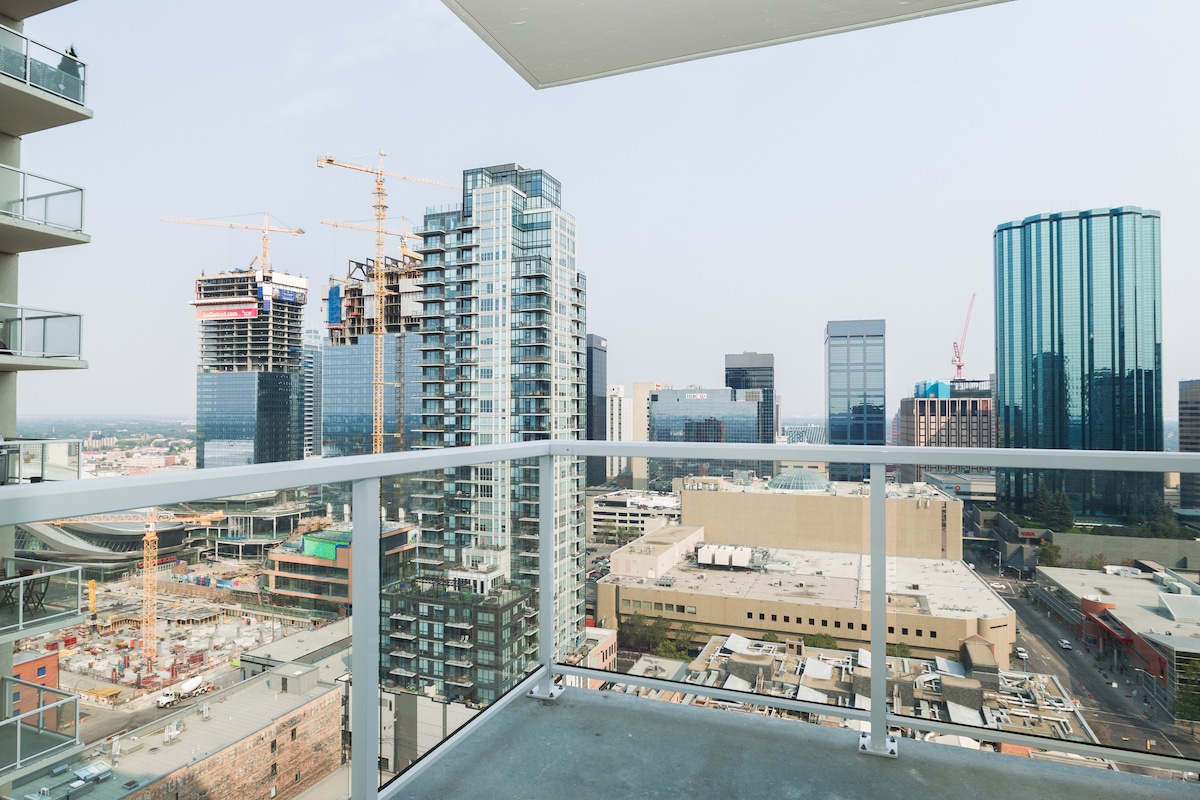 Mientras estés aquí, encontrarás una estancia elegante y privilegiada en el centro de Edmonton con estacionamiento subterráneo/climatizado/seguro gratuito incluido para 1 vehículo. Cerca del transporte público, Rogers Place, el centro comercial City Center, restaurantes, licorerías y River Valley. Internet Gigabit ultrarrápido. Aire acondicionado en la unidad. El condominio de 1 dormitorio y 2 camas dobles (Queen & Double) tiene todo lo que necesitas, incluida la lavandería en la suite, Netflix, cocina completa con todos los elementos esenciales. ¡Incluye reloj de suscripción Sportnet engrasadores y juegos de los Jays!