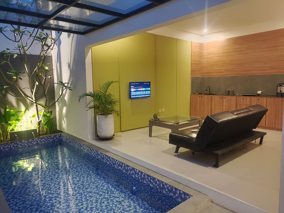 Disfruta de unas vacaciones con una villa artística,equipada con una piscina con aire fresco a los pies del monte Gede. Esta villa nueva recién terminada, construida en enero de 2025, te proporcionará una experiencia diferente y te sacará de las rutinas y actividades de la ciudad. La villa está equipada con 2 dormitorios y baños exóticos en el interior con agua caliente, la Hommy Family Room está equipada con una despensa que te hace sentir como en casa. También equipado con piscina