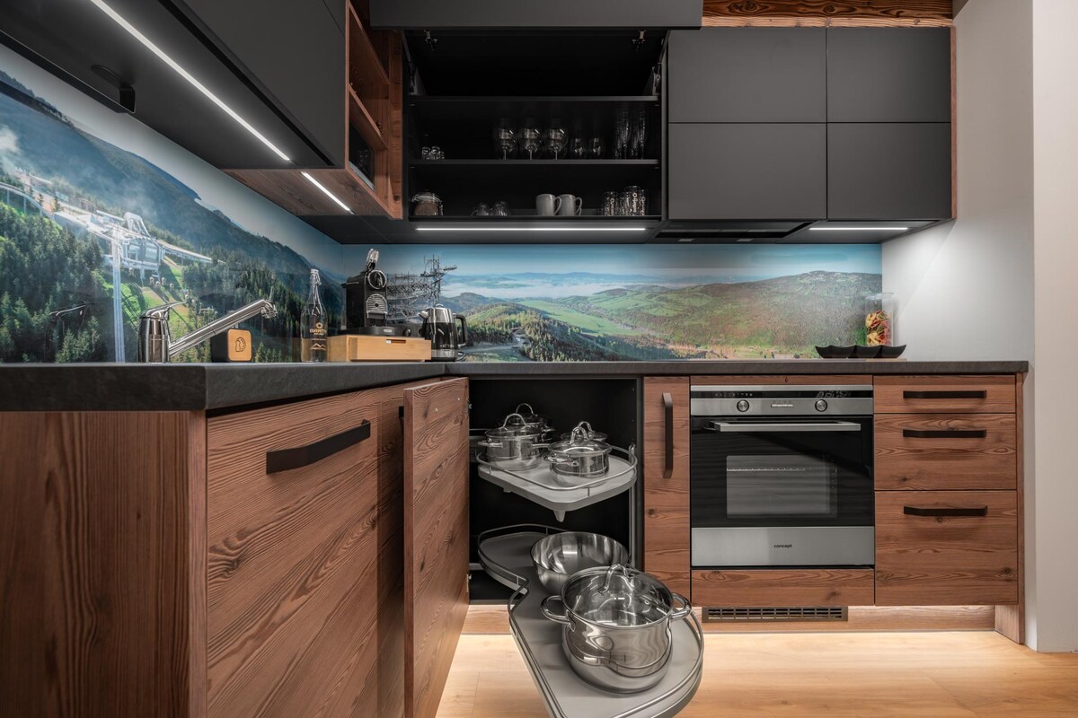 V 1. patře apartmánového domu se nachází stylový apartmán 2+kk v horském designu s krbem a balkónem. V malebné a klidné lokalitě u lesa, kam zavítá i lesní zvěř, máte vše na dosah. Pouhých 600 metrů je lanovka u hotelu Vista, která vás zavede na všechny místní turistické atrakce jako je Mamutí horská dráha, Sky Bridge 721 nebo Stezka v oblacích. Tento prémiový apartmán s jednou ložnicí pro 6 osob je ideální volbou pro rodinu hledající kombinaci luxusu, horského stylu a přírody.