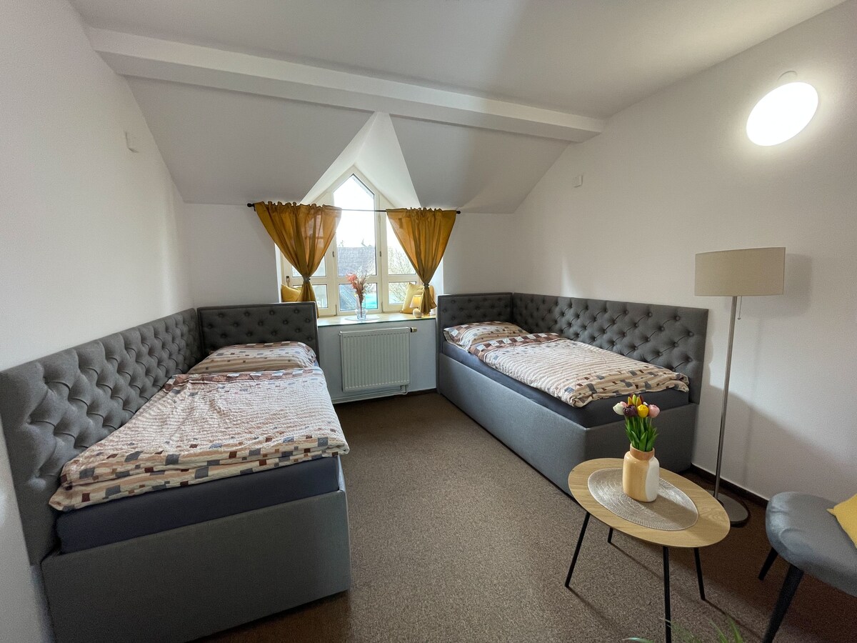 Habitación triple en el Hotel Colchi en Střelice, cerca de Uničov, que se encuentra en la ruta Litovel – Červenka – Střelice – Uničov en la zona de Litovelské Pomoraví, que atrae ciclismo y senderismo. El hotel tiene un total de 13 habitaciones. Nueve habitaciones son dobles, tres habitaciones triples y una de cinco camas, con una capacidad total de hasta 32 personas. En la planta baja hay un famoso restaurante de cazadores con un jardín de verano.