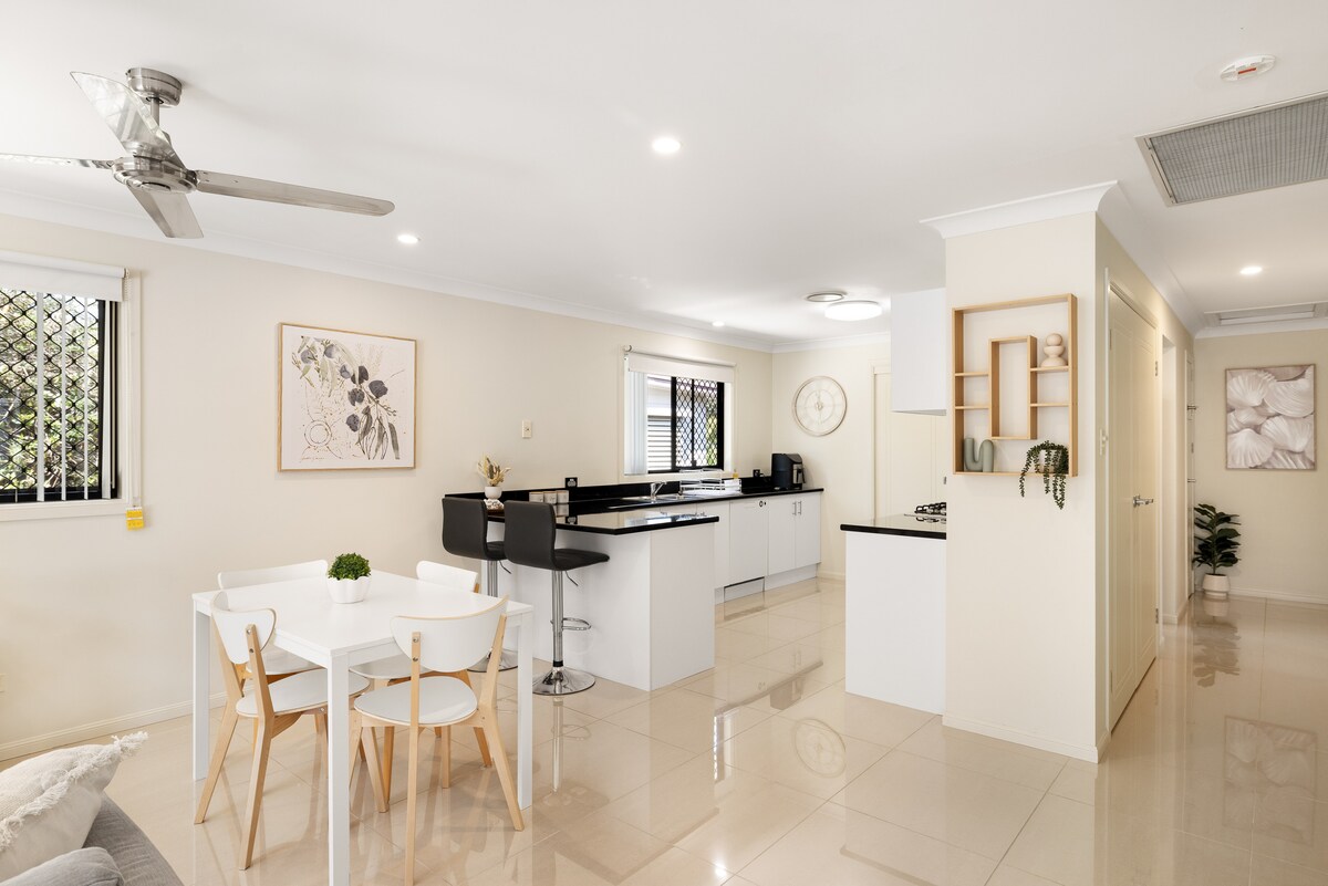 Casa de 2 dormitorios totalmente independiente en la bahía de Brisbane. Tiddabinda (sister's sitdown) es una casa urbana contemporánea de estilo aborigen con 2 dormitorios totalmente independientes de confort y comodidad moderna. Con su propia entrada principal, jardín delantero totalmente vallado, salón con excelentes opciones de entretenimiento, una cocina moderna de tamaño completo, baño grande, armarios de tamaño completo, es tu hogar. Tienes tu propia entrada, salón de tamaño completo, cocina totalmente funcional (nevera de tamaño completo, horno, fogones), un baño enorme y dos dormitorios (ambos con camas tamaño queen) con armarios de tamaño familiar. Todas las comodidades modernas están incluidas, como Foxtel, Telstra TV, Google Home e internet de alta velocidad NBN ilimitado (wifi). Esta casa «inteligente» es respetuosa con el medio ambiente, utiliza solo productos no tóxicos y está equipada con dos aparatos de aire acondicionado y ventiladores de techo en todas partes, lo que garantiza tu comodidad en cualquier época del año. Toda la casa tiene agua filtrada que es deliciosa para beber. Todos los productos de limpieza se proporcionan de forma gratuita, ya que esta es mi casa y prefiero mantenerla lo menos tóxica posible. El área para fumadores está restringida solo al porche delantero. Gracias por respetar esto. Los huéspedes tienen acceso al gran patio cubierto y al área al aire libre de la piscina, ideal para tomar café por la mañana mientras ves salir el sol y escuchas los hermosos sonidos de las aves autóctonas que saludan el día o para relajarte con los sonidos de la cascada por la noche mientras bebes un poco de vino local de Sirromet Winery, justo al final de la carretera. Tendrás total privacidad durante tu estancia, pero estaré disponible si necesitas ayuda o consejo con cualquier cosa. Vivo en la mitad trasera de la casa y tengo mi propia entrada. Puede que me veas ir y venir y siempre te saludaré con la mano. Respeto tu privacidad, pero si te apetece charlar con un café o vino, siempre estoy dispuesto a conversar e intercambiar historias. Me encanta descubrir las culturas de otras personas y estoy muy dispuesta a compartir la mía. El apartamento se encuentra en un barrio tranquilo con muchas zonas verdes abiertas, senderos para caminar y mucha vida silvestre. Los principales centros comerciales y una zona de entretenimiento están a poca distancia a pie, a solo 7 minutos del complejo deportivo Sleeman's y del campo de tiro Belmont, a 10 minutos de la bodega Sirromet, a 20 minutos del aeropuerto, a 15 minutos de Cleveland (ferry a la isla Stradbroke (Minjerribah) y a 35 minutos del centro de Brisbane. A poca distancia a pie del transporte público y de las rutas locales de senderismo por el monte. La mayoría de la gente usa coches privados, pero tanto los taxis como Uber están disponibles. Si necesitas alquilar un coche, hay un coche de repuesto en la propiedad. Ubicados en Capalaba, estamos a 7 minutos de Chandler (sede del complejo deportivo Sleeman y del campo de tiro Belmont) con transporte público sencillo a esos lugares. A poca distancia a pie se encuentra el recinto de entretenimiento de Capalaba con dos centros comerciales, restaurantes y cines, así como un importante intercambio de autobuses que proporciona transporte público alrededor de Brisbane (a 45 minutos del distrito financiero de Brisbane). La bodega Sirromet (que alberga eventos Day on the Green) está a 12 minutos por carretera, el ferry a varias islas de la bahía de Moreton está a 17 minutos por carretera, el aeropuerto está a 20 minutos y a solo 50 minutos del estadio Carrara en la Costa Dorada. Dreamworld, MovieWorld, Wet n Wild, Outback Spectacular y Seaworld están a menos de una hora en coche. Hay un escalón en la entrada de la casa, pero todo es de un solo nivel una vez dentro. Las habitaciones son del tamaño de una casa familiar. El patio delantero está vallado y tus bebés peludos bien educados son bienvenidos una vez aprobados (por favor, avisa con antelación). La casa se encuentra en un barrio tranquilo con mucho espacio verde abierto, senderos para caminar y mucha vida silvestre. Los principales centros comerciales y un recinto de entretenimiento están a poca distancia a pie, a solo 7 minutos del complejo deportivo Sleeman's y del campo de tiro Belmont, a 10 minutos de la bodega Sirromet, a 20 minutos del aeropuerto, a 15 minutos de Cleveland (ferry a la isla Stradbroke (Minjerribah) y a 35 minutos del centro de Brisbane.