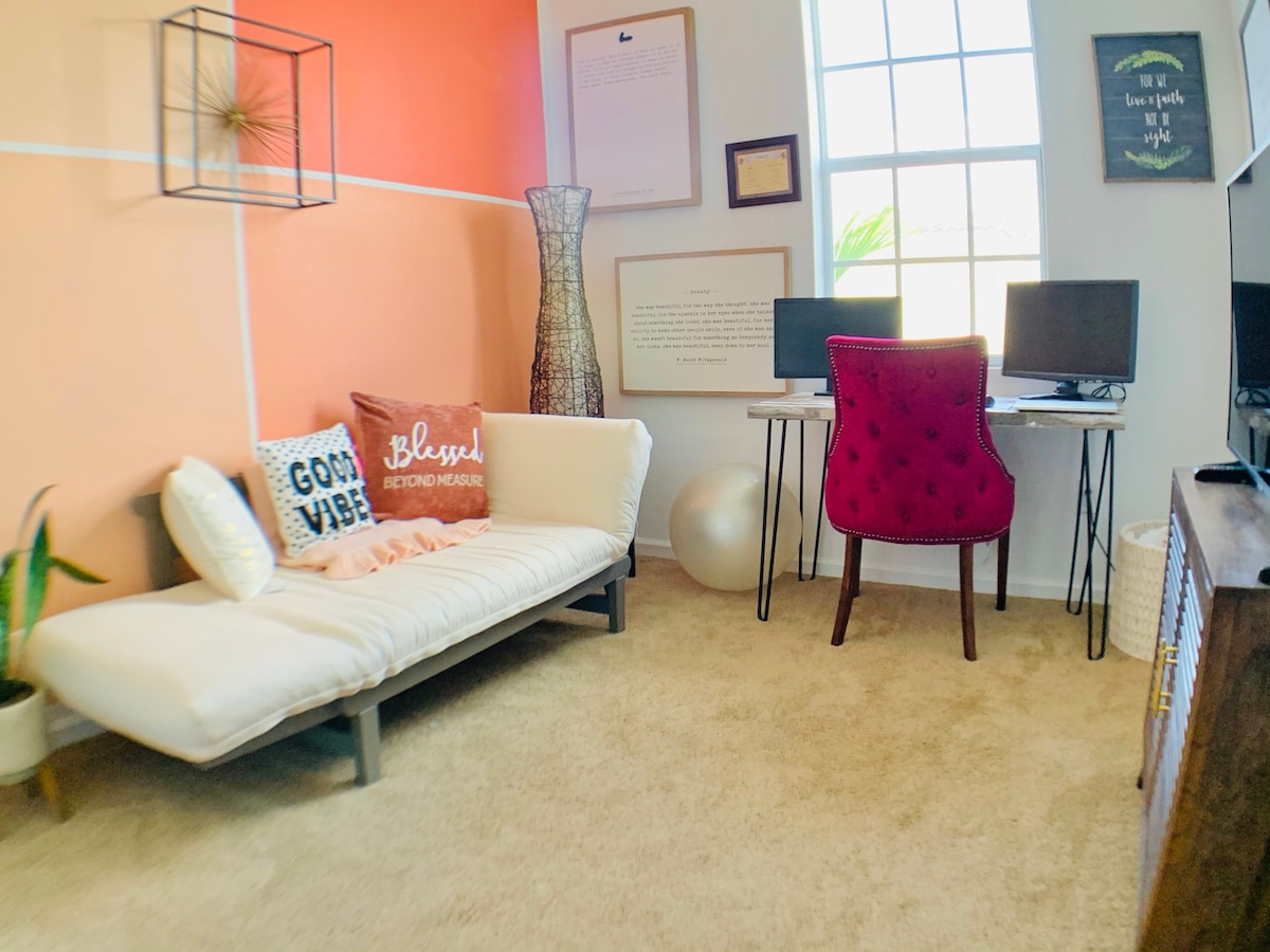 Esta casa adosada bellamente decorada tiene capacidad para 6 huéspedes con 2 dormitorios tamaño king y un sofá cama de tamaño completo en la sala de estar. La cocina totalmente equipada cuenta con electrodomésticos SS y encimeras de granito. Sal a tu patio privado y vallado con barbacoa de carbón, hamaca relajante y espacio para que tu mascota deambule. Estacionamiento para 2 vehículos, lavadora y secadora en la unidad, y sin lista de tareas para que tu estancia sea libre de estrés. ¡Observa a hermosos pavos reales deambular por el vecindario durante tu estadía!