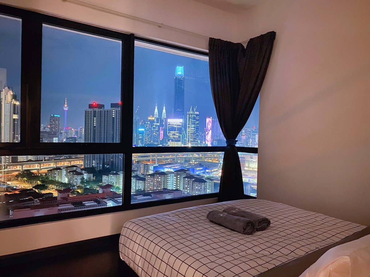Apartamento de 5 estrellas recién renovado en el corazón de la ciudad de Kuala Lumpur. Estación de tren justo delante de tu puerta (MRT y LRT). Cómodas y espaciosas suites de 2 dormitorios (65 metros cuadrados) con increíbles vistas al horizonte de Kuala Lumpur. Fácil acceso a todas partes, a solo unos pasos del centro comercial, Sunway Velocity Medical, IKEA, MY TOWN, restaurante, cafetería, tienda de comestibles (7-11, myNEWS, AEON), pub/club de vida nocturna. Conexión wifi a internet ilimitada de 500 Mbps disponible y gratuita. 3 camas para un máximo de 5 personas.