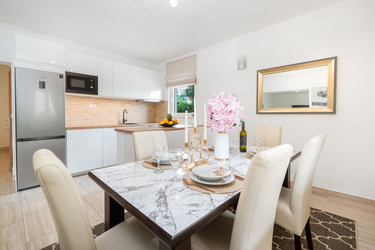 Villa de lujo frente a la playa Kebeo Nueva villa de lujo equipada con un alto nivel de calidad, ubicada a 200 metros de una de las playas de arena más hermosas de Croacia, Duce. La villa ofrece 2 apartamentos y 1 ático, que están disponibles por separado o como una unidad completa. Todos los apartamentos están totalmente climatizados y equipados con televisores inteligentes e internet de alta velocidad. La zona exterior ofrece una piscina para toda la comunidad, una cocina de verano y una sala de recreo.