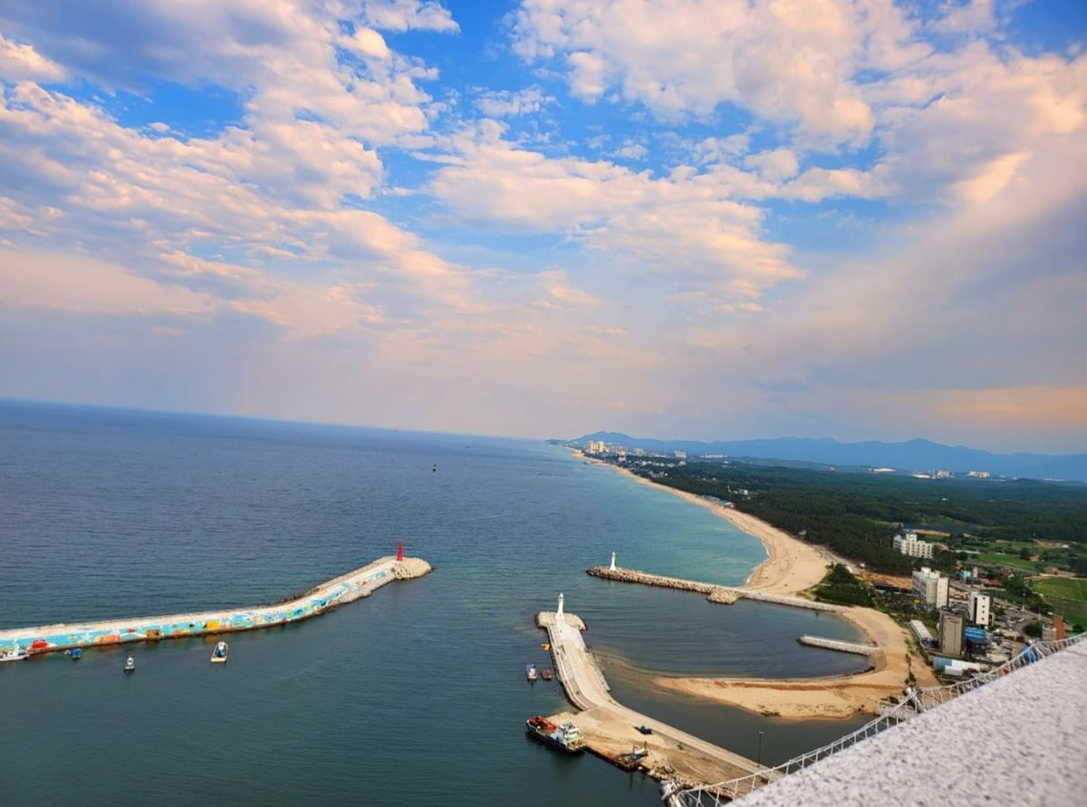 Este alojamiento ofrece una vista al mar abierto desde la ubicación más cercana a la playa Jukdo. ♥ Disfrute del mar, del amanecer y del sonido de las olas desde la cama de este alojamiento de categoría real:) Hay una cama queen size grande, ropa de cama blanca de hotel, bonitas luces y marcos, flores, por lo que puede tomar fotos sensacionales para Instagram, y Google Chromecast 4 está instalado, por lo que puede usar su propia cuenta de Netflix, Disney+, Teabing, etc. La playa de Ingu (la calle principal para surfear) está a 15 minutos a pie, y como está un poco alejada, es tranquila y limpia. Hay una tienda de conveniencia justo al lado de la casa, y hay un Nonghyup Hanaro Mart, un pub, etc. en los alrededores. El mercado de pescado de Jumunjin, donde el sashimi es fresco y barato, está a 15 minutos (13 km) en coche del alojamiento, por lo que recomendamos comprar sashimi y comerlo en el alojamiento :) Dongsan/Jukdo/Ingu Beach, Namae 3-ri Beach están conectadas, por lo que puede caminar por la playa y sentir el mar de una manera diferente. Esperamos que pueda crear recuerdos felices en el E7 Jukdo Room 1204, ubicado en la mejor ubicación. ●' '●● ''●