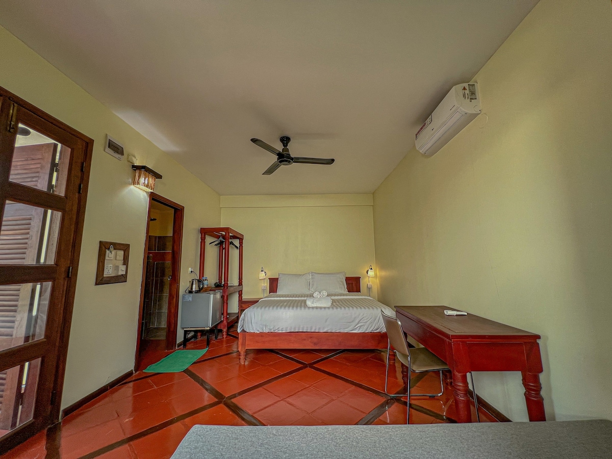 Relájate por completo y olvídate del mundo en esta serena y verde casa familiar con vistas a los arrozales en las afueras de Siem Reap. Duerme en un precioso dormitorio con suelo de madera y aire acondicionado y despierta con un café recién hecho y desayuno en tu terraza con vistas a los campos de arroz. Tienes total privacidad y todo el espacio para ti, pero tus anfitriones están cerca para lo que necesites. ¡El alojamiento perfecto en Siem Reap!